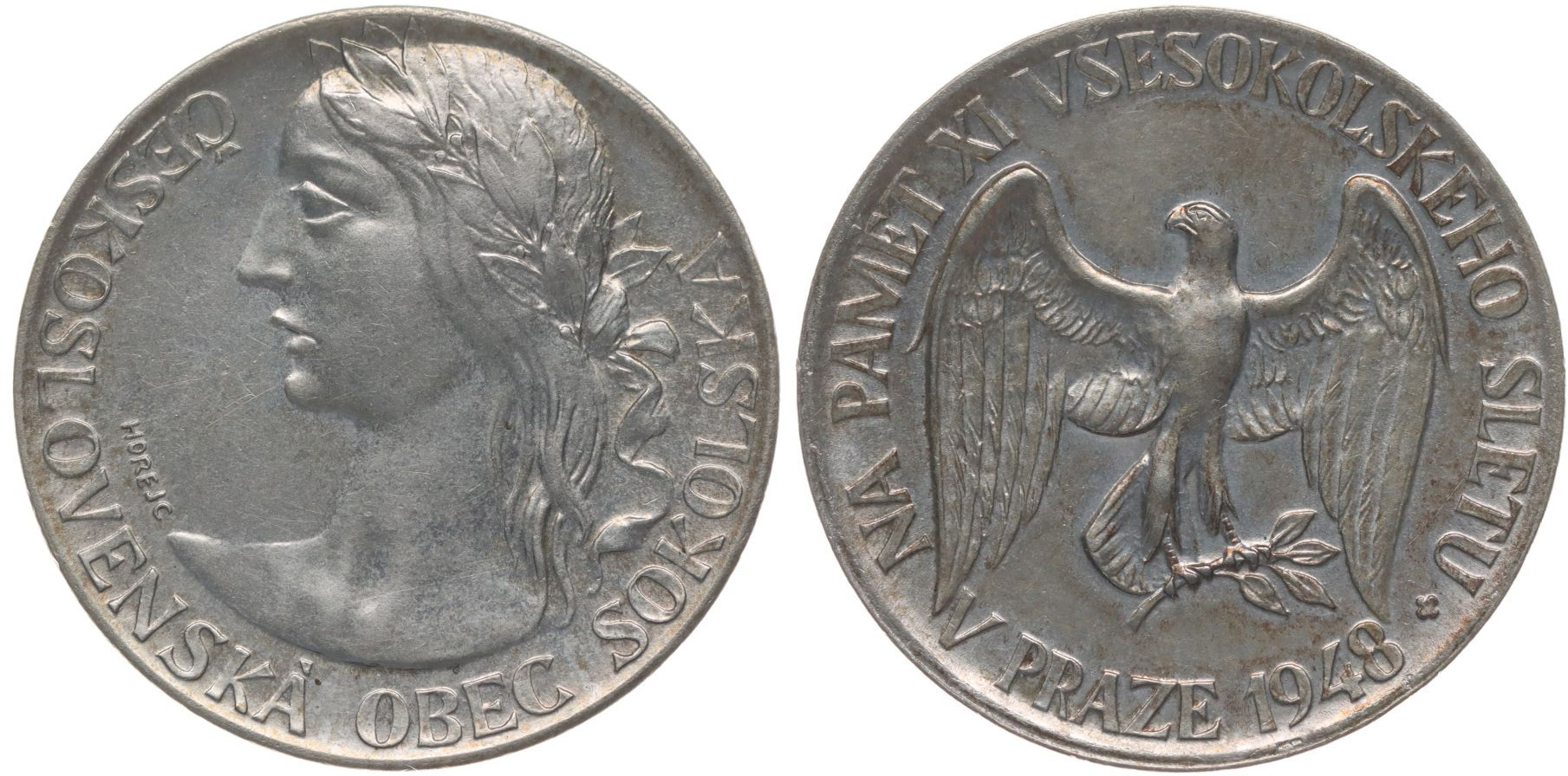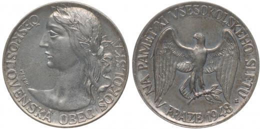 ČOS - Na paměť XI. všesokolského sletu v Praze 1948 Poprsí ženy zleva, opis / sokol s rozepjatými křídly, opis, Sign., Punc., Ag 500/1000, 28 mm, 13,6 g