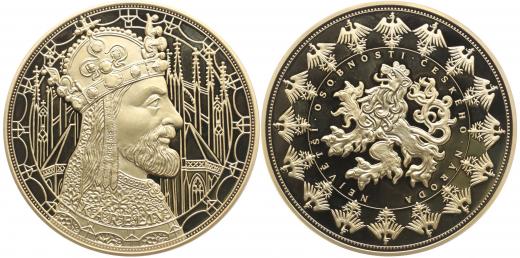 700 let od narození Karla IV. 1316 - 2016 Poprsí zprava, v pozadí chrám svatého Víta / český lev zleva, po obvodu orlice - z edice Největší osobnosti českého národa Pozlac.bronz 88,7 mm, 340 g_orig.etue + kapsle + certifikát