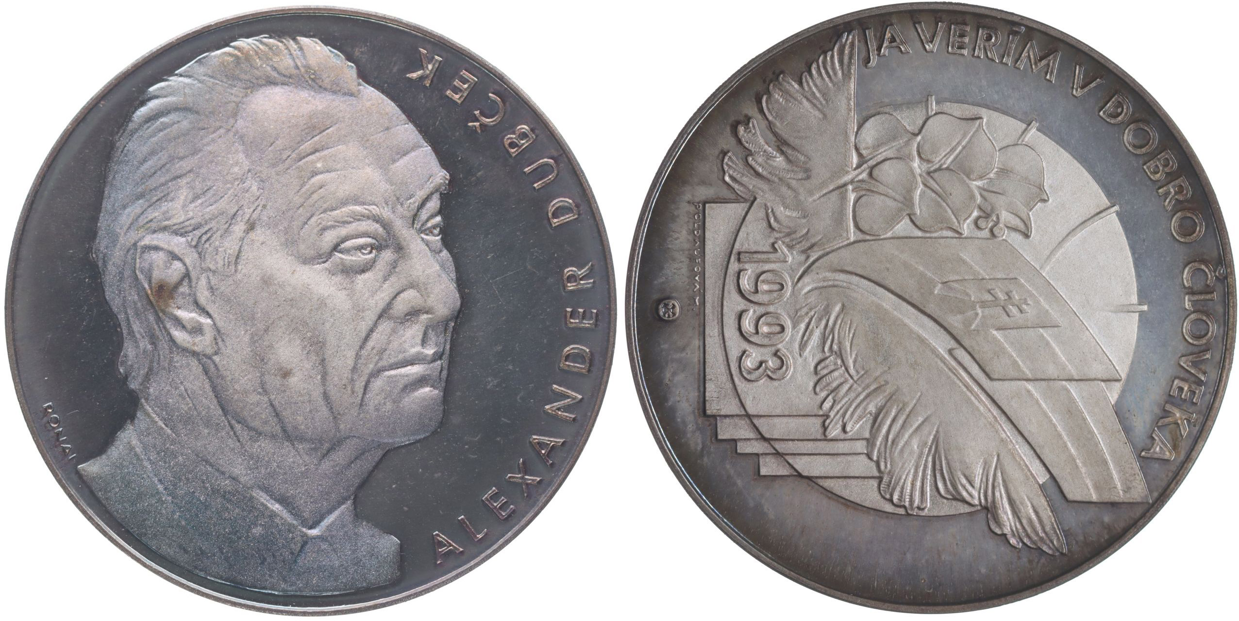 Alexander Dubček - Já verím v dobro človeka, 1993 Hlava mírně zprava, opis / na glóbu slovenská vlajka a ratolest Sign., Punc.900, Ag 40 mm, 38,88 g