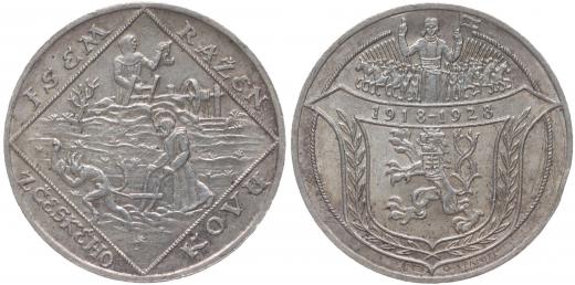 Jsem ražen z českého kovu - 10. výročí republiky 1928#Ag Sv.Prokop orá s čertem, havíř, opis / státní znak, Sv.Václav s rytíři, Sign., Punc.987, Ag 34 mm, 20.1 g