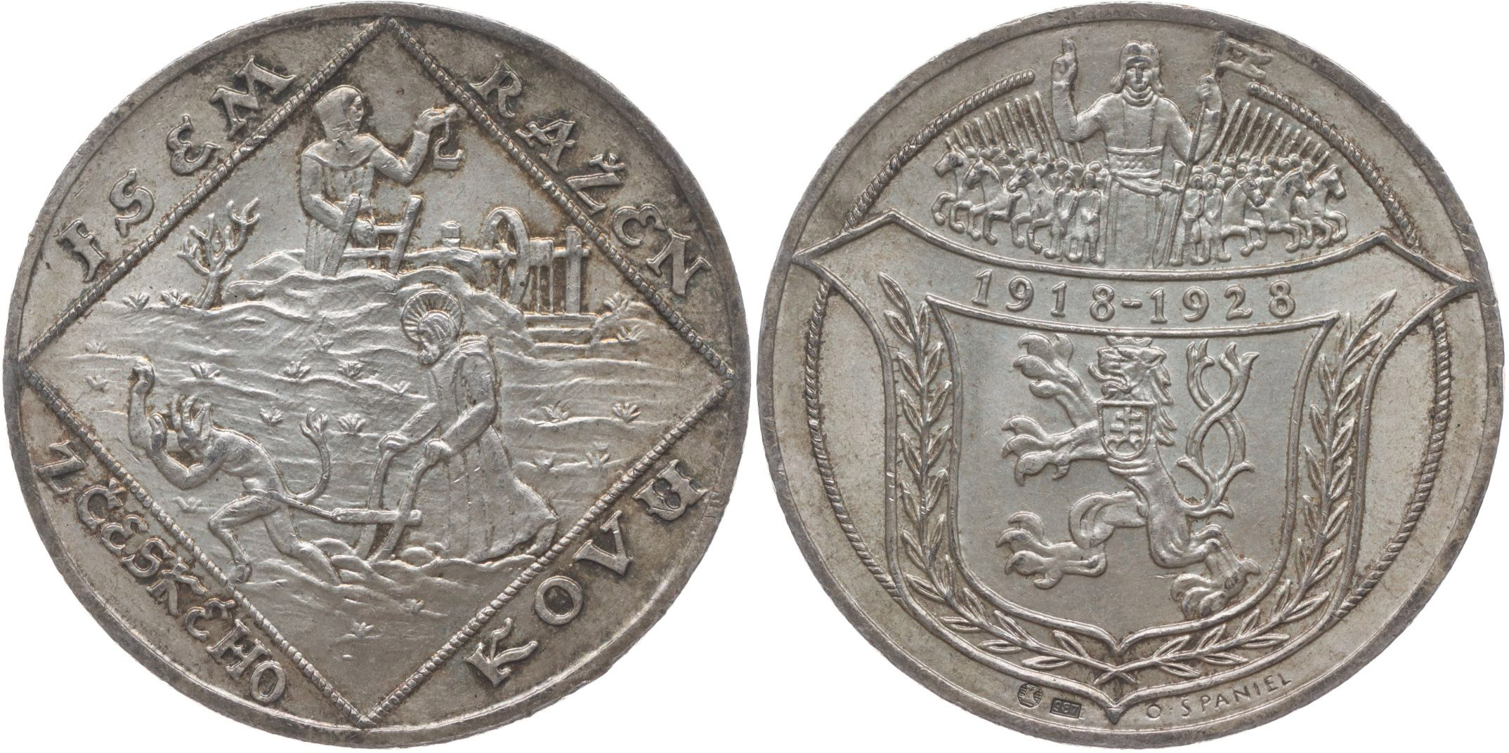 Jsem ražen z českého kovu - 10. výročí republiky 1928#Ag Sv.Prokop orá s čertem, havíř, opis / státní znak, Sv.Václav s rytíři, Sign., Punc.987, Ag 34 mm, 20.1 g