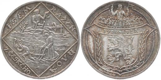 Jsem ražen z českého kovu - 10. výročí republiky 1928#Ag Sv.Prokop orá s čertem, havíř, opis / státní znak, Sv.Václav s rytíři, Sign., Punc.987, Ag 34 mm, 20.1 g