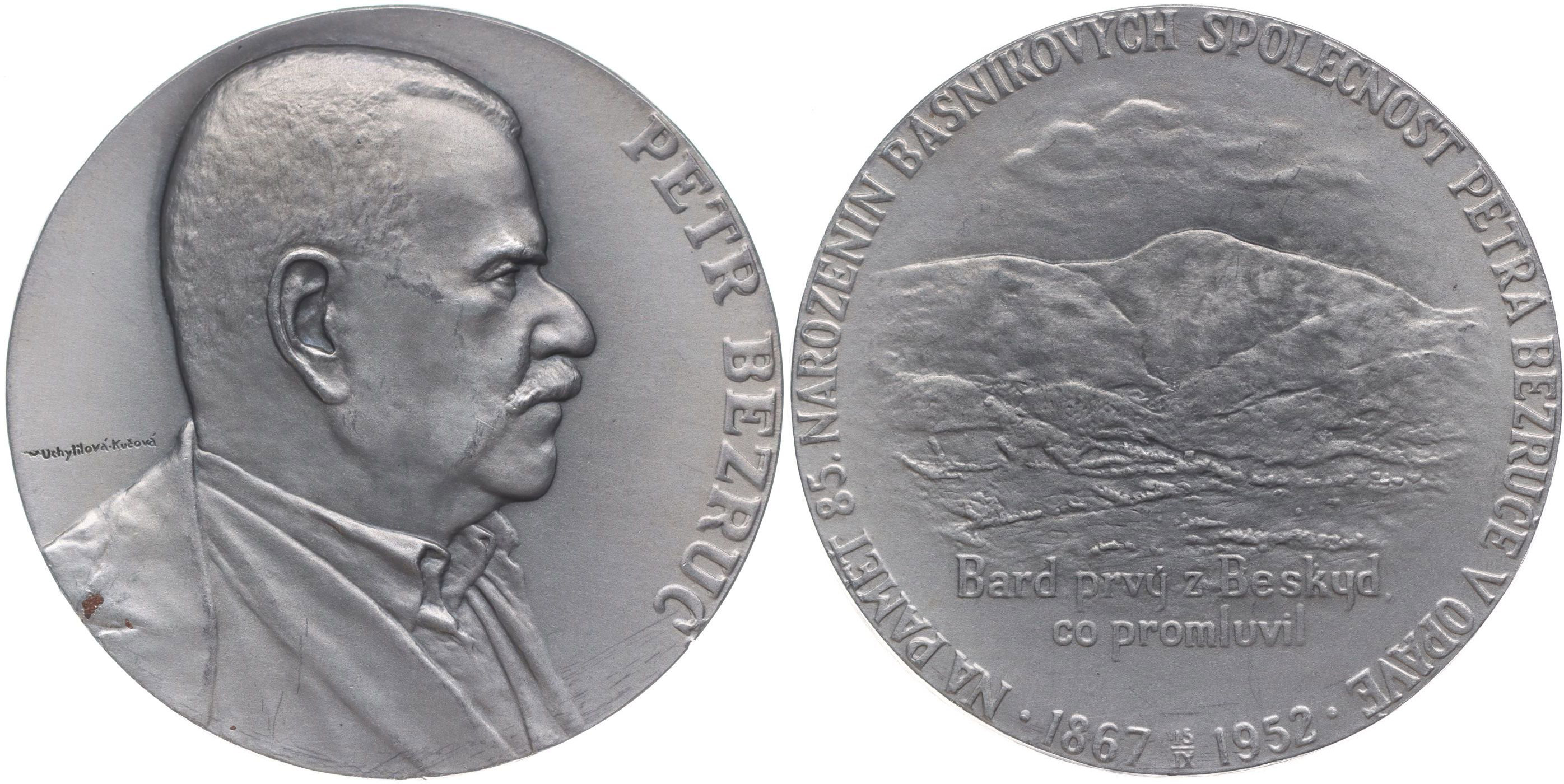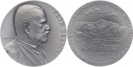 Petr Bezruč - 85.výročí narození, 1952 Poprsí zprava, opis / horská krajina, nápis a opis, Sign., Punc., Ag 987/1000, 60 mm, 98,30 g, PZ.405, SJ.I.I_R!