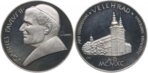 Jan Pavel II. - návštěva na Velehradě, 1990#Ag Poprsí zleva, opis / kostel, opis, Sign.JU, Punc. na hr.925 Ag 60 mm, 111 g _orig.etue