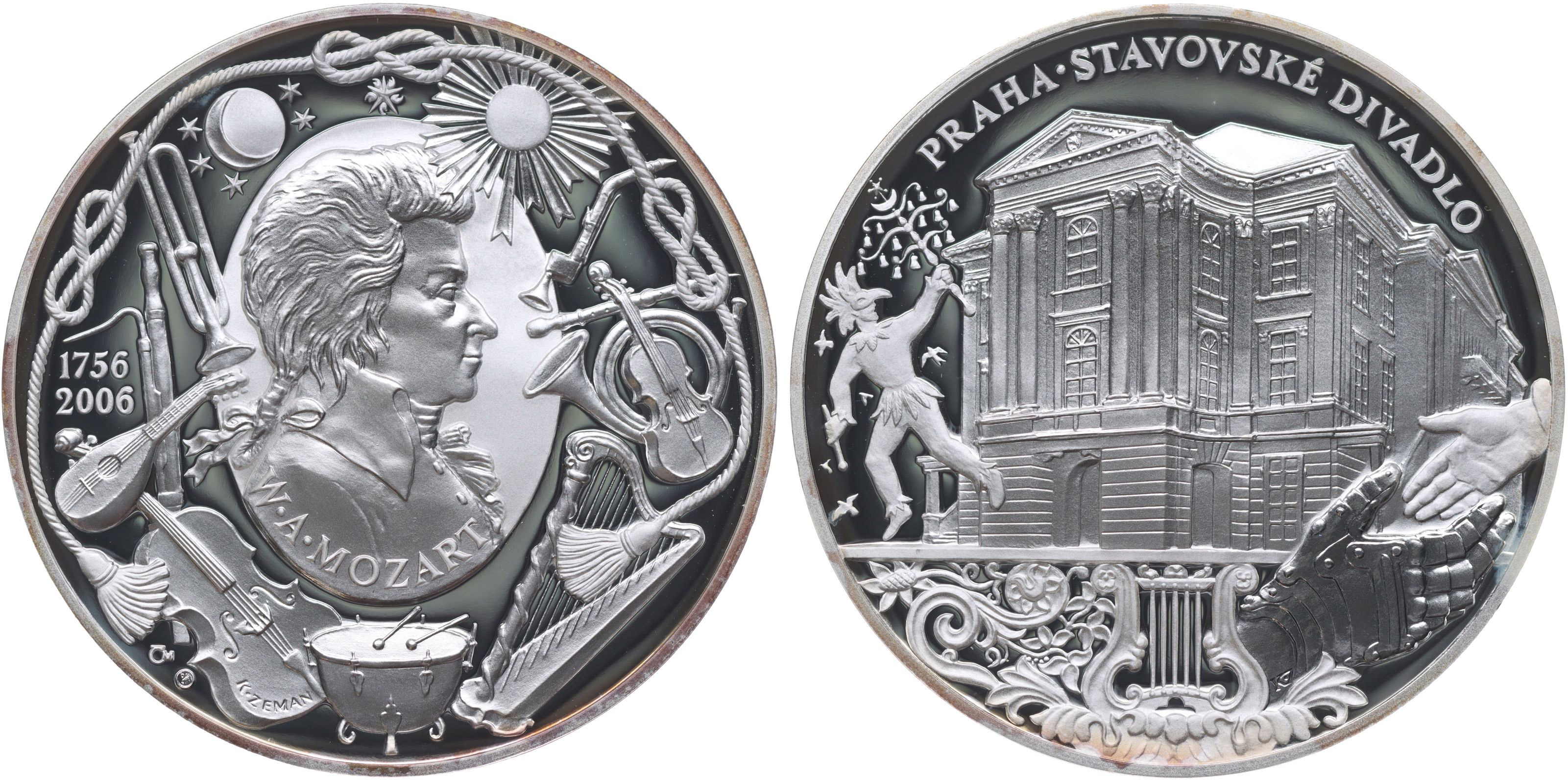 250.výročí narození W.A.Mozarta, 1756 - 2006 Oválný medailon s portrétem, kolem hudební nástroje, opis / stavovské divadlo, opis, Sign., Punc.999, Ag 50 mm, 42 g, KZ.185 _orig.kapsle + etue + certifikát