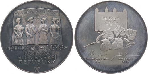 Ústava Slovenskej republiky 1.9.1992, Čtyři postavy v otevřené knize, 3řádk.nápis / lipová ratolest pod Bratislavským hradem, dva podpisy, Sign.DZ, Punc.900, Ag 40 mm, 31,78 g