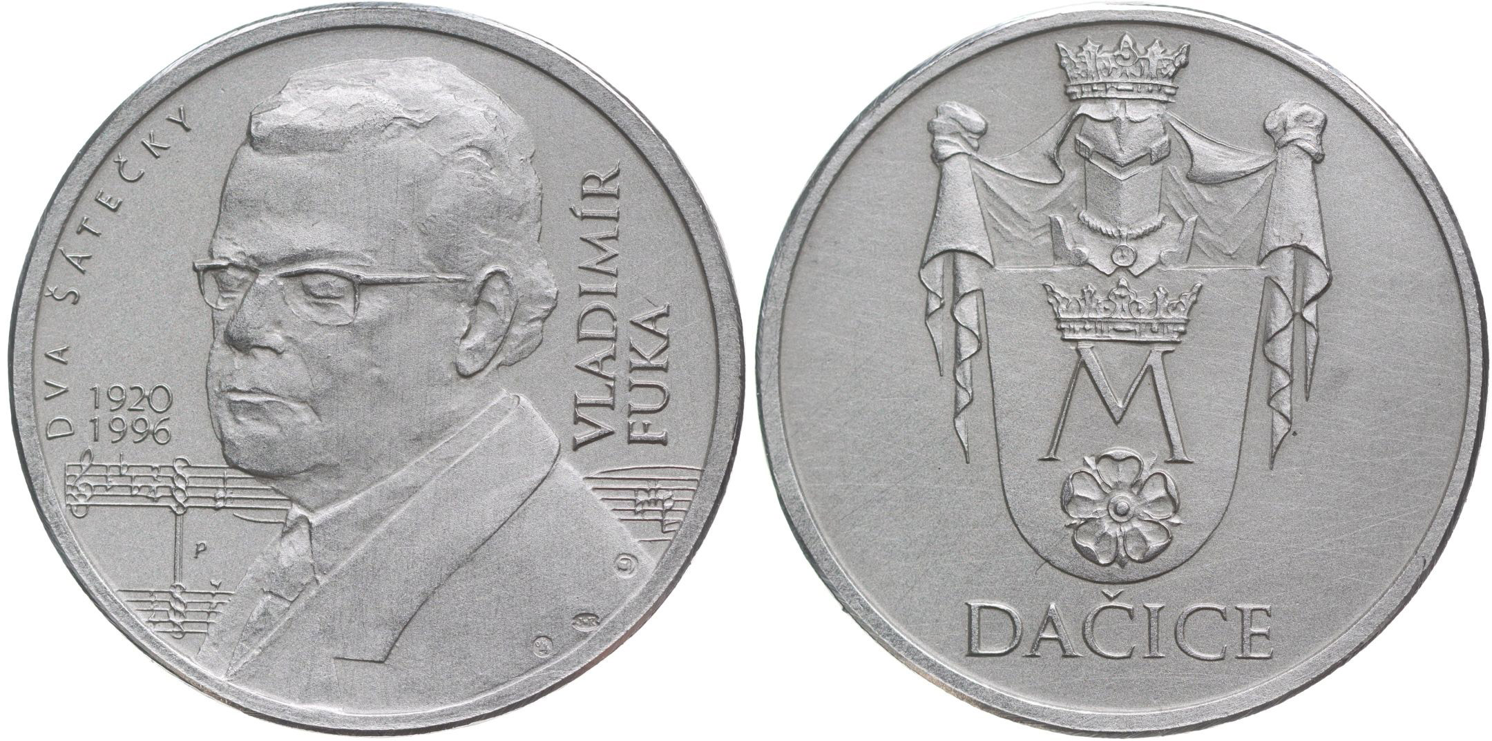 Vladimír Fuka (hudební skladatel) - medaile k úmrtí b.l. (1996) Poprsí zleva, dvouřádk.nápis, opis / znak města, nápis Sign.J.Orava., Punc.999 Ag 34 mm, 15,55 g_orig.etue + kapsle + certif.