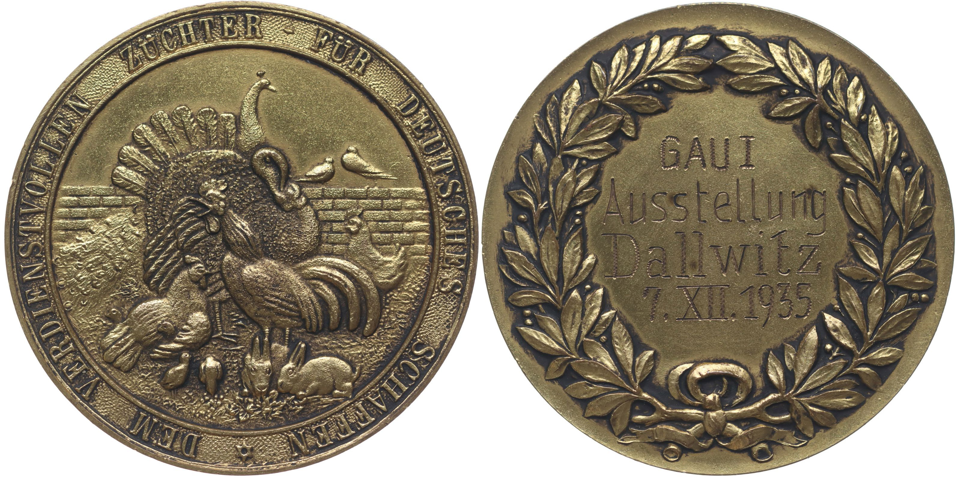 Za pěstitelské zásluhy - německá sekce, župní výstava 7.XII.1935 Domácí zvířata u zdi, něm.opis / 4řádk.vyrytý nápis ve věnci Nesign., Pozlac.bronz 50 mm, 54 g