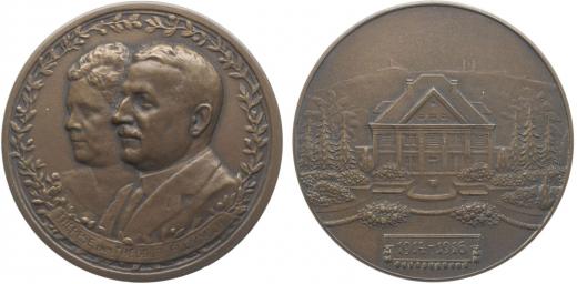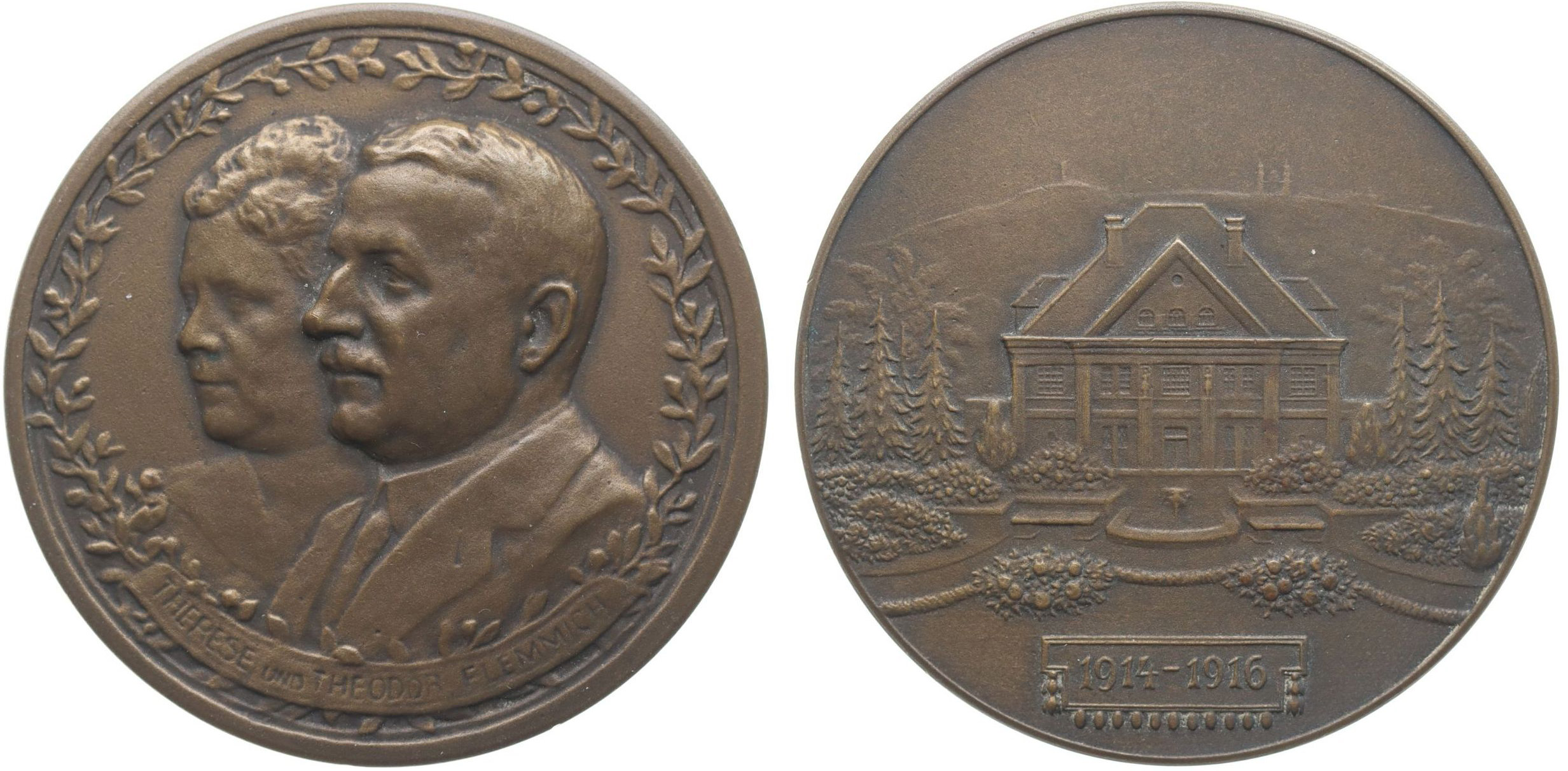 Therese a Theodor Flemmich (podnikatel v Krnově), 1914 - 1916 Dvojportrét zleva, na stuze jména, po obvodu věnec / pohled na vilu, vročení, Nesign., Bronz 52 mm