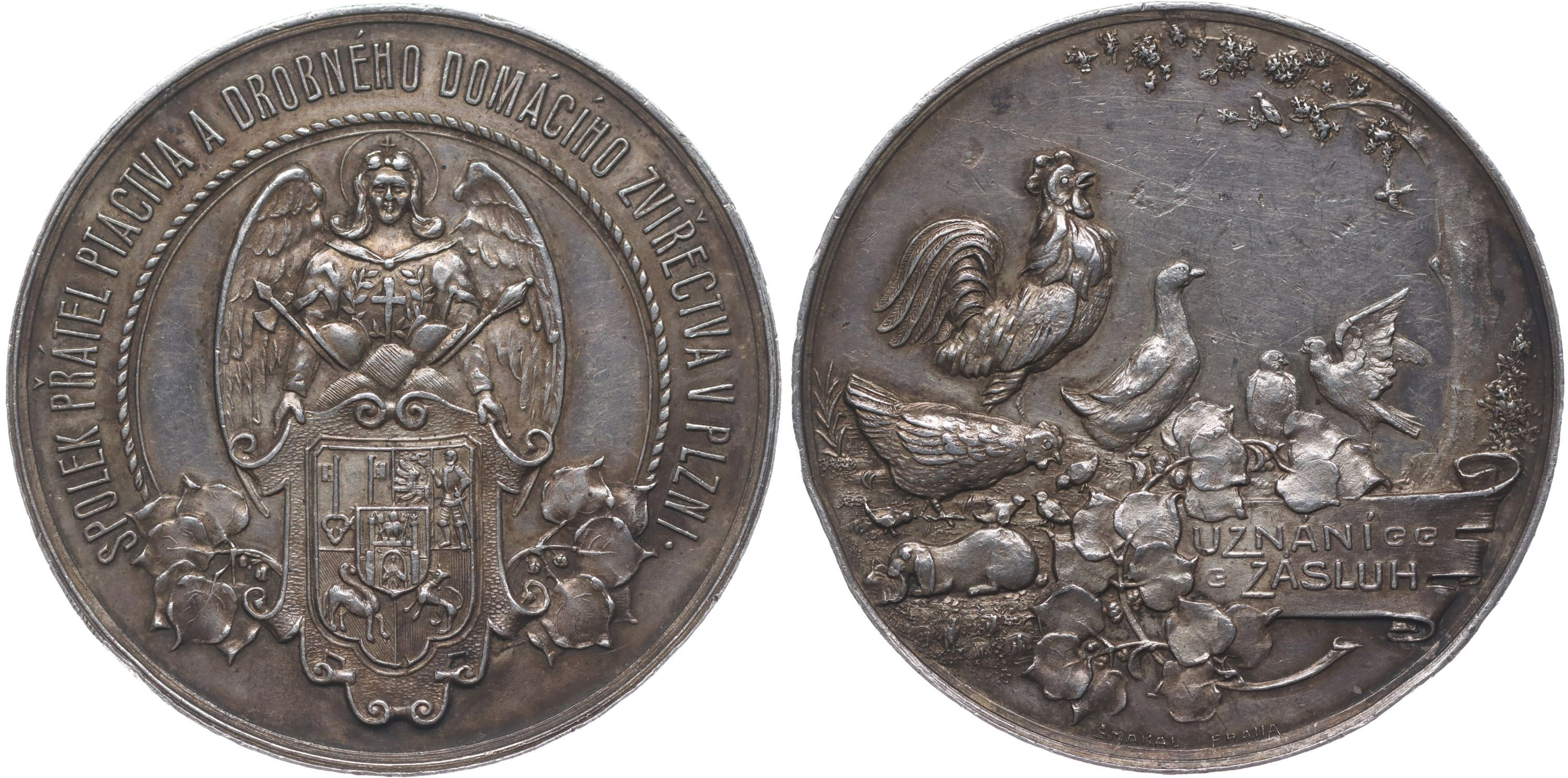 Šmakal Praha - spolek přátel ptactva a drobného domácího zvířectva b.l., znak města v lipových listech, opis / domácí zvířectvo na stuze Uznání zásluh, Sign., Punc. Ag 47 mm_dr.ďubky v rev.