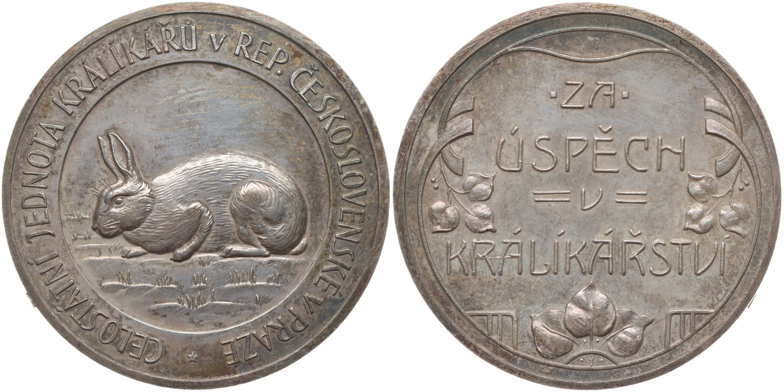 Nesign. - celostátní jednota králíkářů v Rep.československé, b.l. Za úspěch v králíkářství, sedící králík zleva, opis / 4řádk.nápis s lipovými listy, Postř.bronz 39 mm, 21 g
