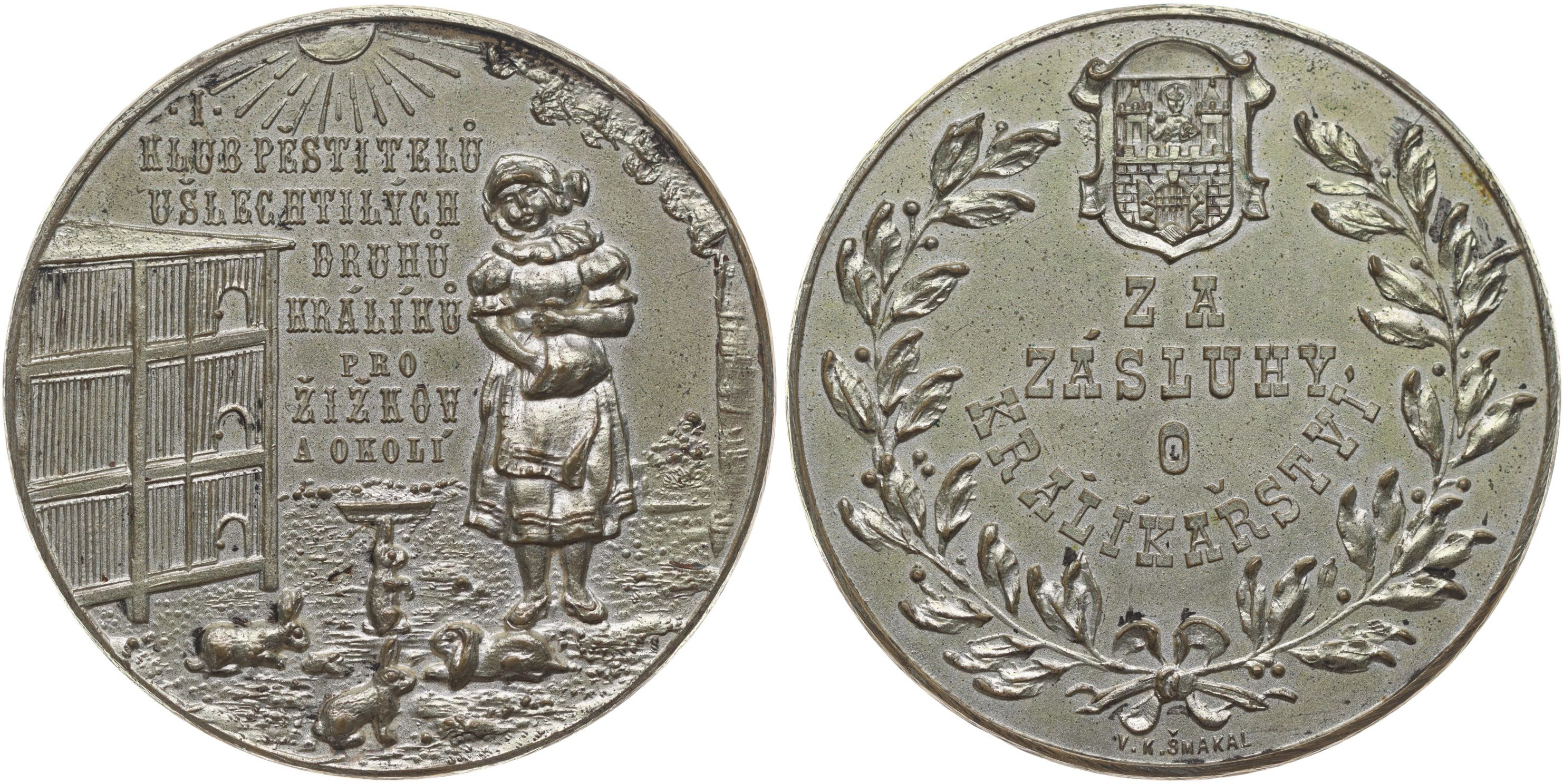 Šmakal - I.klub pěstitelů králíků pro Žižkov a okolí, b.l. Děvečka s králíky u kotců, 7řádk.nápis / 4řádk.nápis Za zásluhy o králíkářství ve věnci pod znakem, Sign., Postř.bronz 45 mm, 33 g