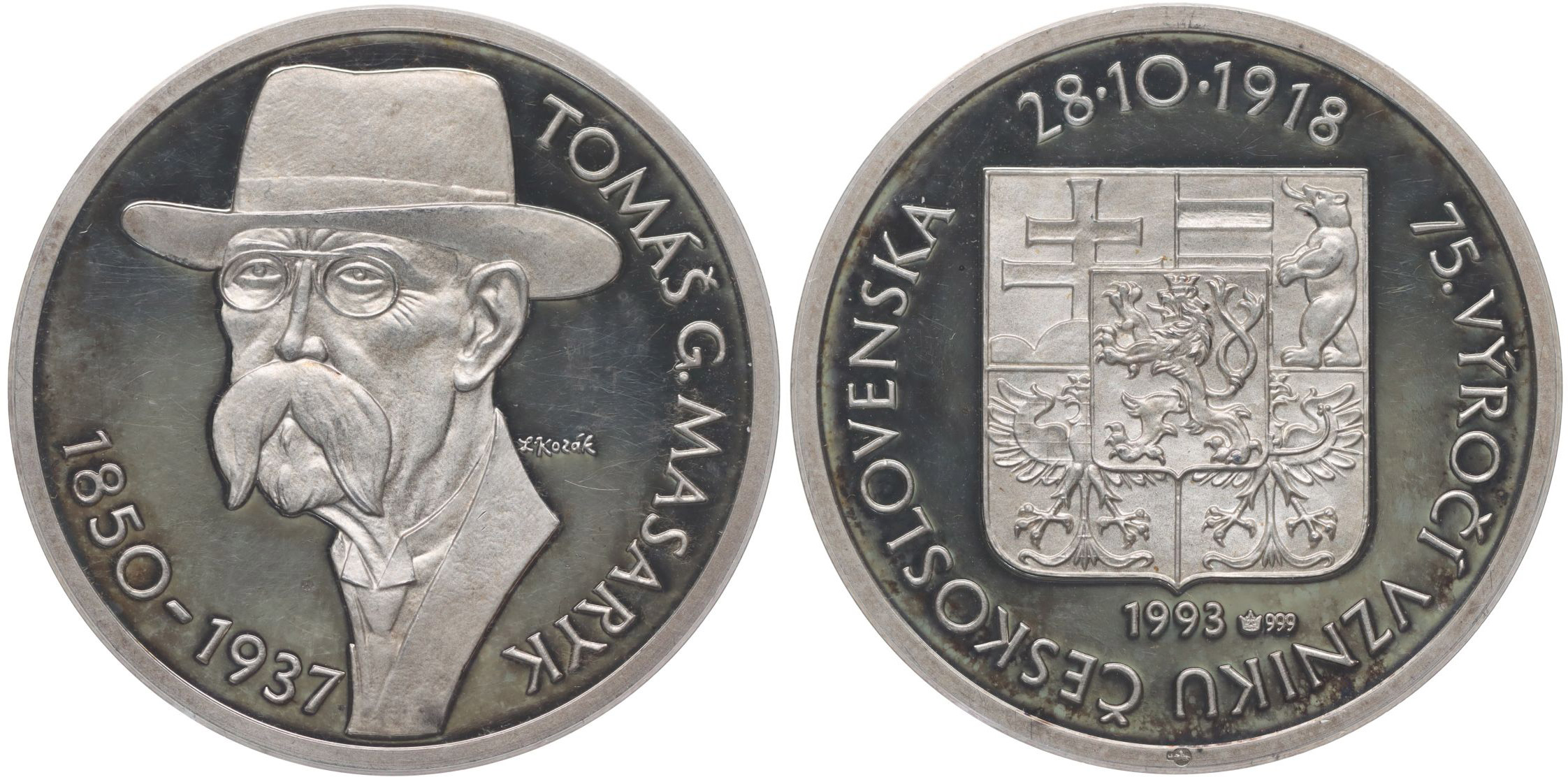 L.Kozák - T.G.Masaryk - k 75.výročí vzniku ČSR 1993 Poprsí čelně, opis / státní znak, opis, Punc.999, Ag 35 mm, 14.9 g Nov.01.226a_orig.etue