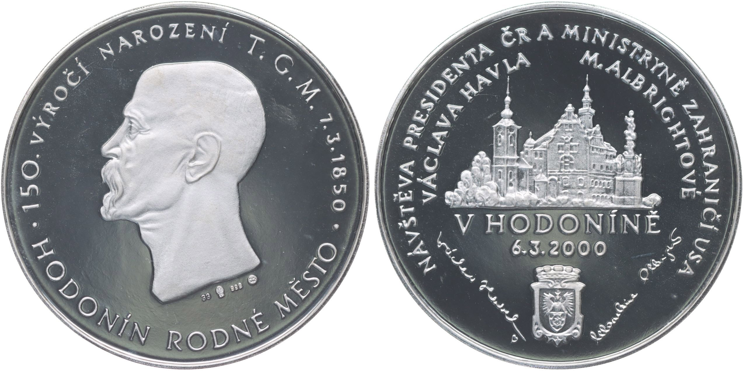 L.Bódi - Hodonín - k 150.výročí nar.T.G.Masaryka a návštěvy V.Havla a M.Albrigthové 6.3.2000, portrét TGM zleva, opis / dominanty města, dvojitý nápis, dvojitý opis, faksimile podpisů, Sign., Ag 40 mm, 31.1g čís.33 (nákl.100 ks), Nov.01.245b_orig.etue + kapsle + certifikát