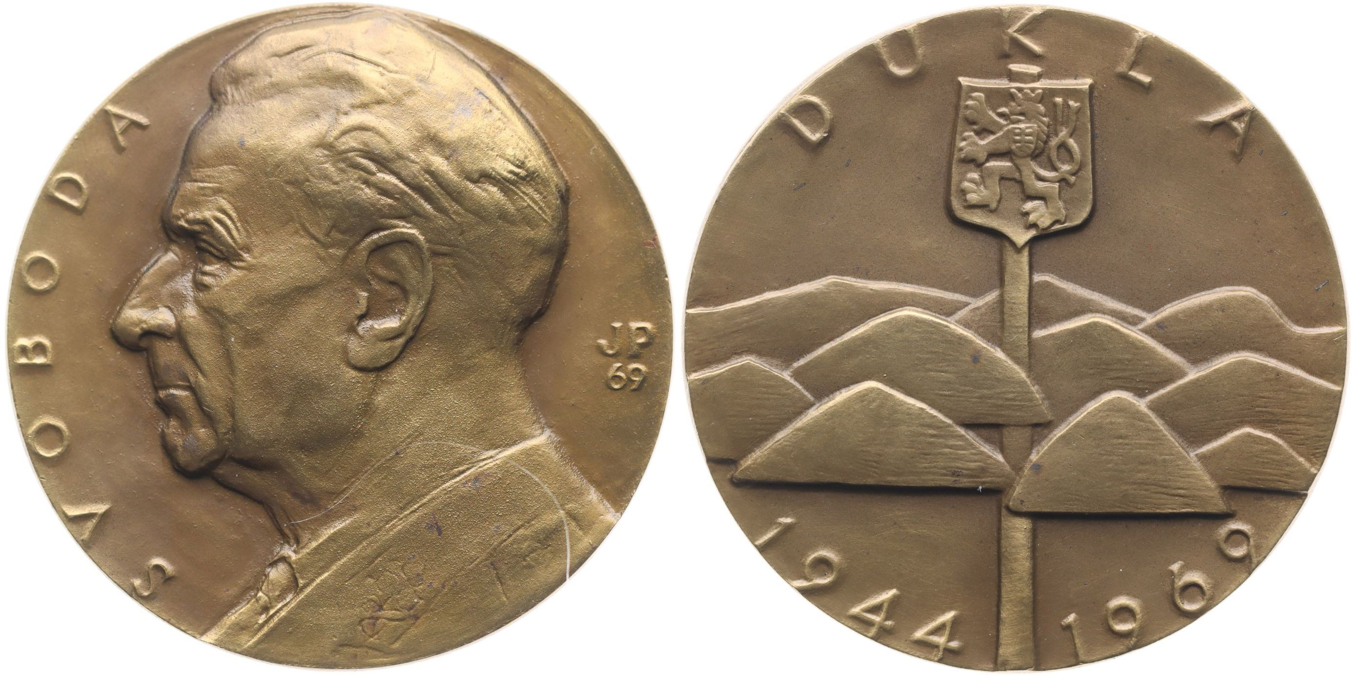 J.Prádler - pamětní medaile na 25.výročí bojů u Dukly 1944 - 1969 Poprsí prezidenta zleva, opis / hraniční sloup se státním znakem, opis Nesign., Bronz 60 mm, Nov.07.009a