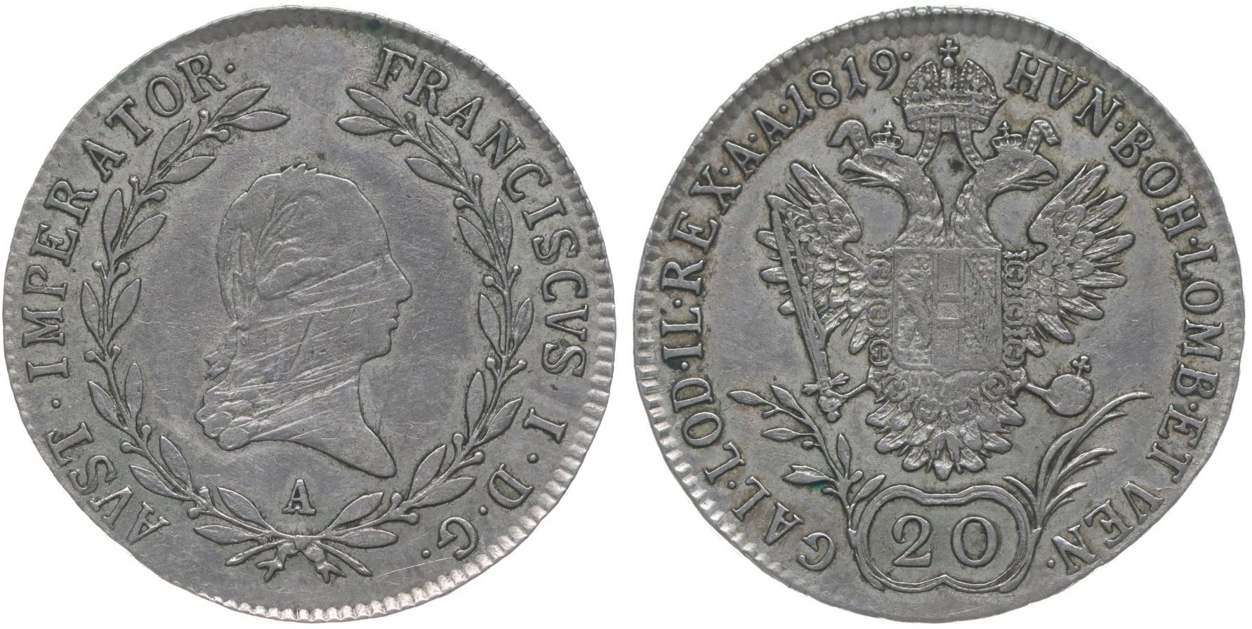 20 Krejcar 1819 A, Her.742_dr.just. v av.