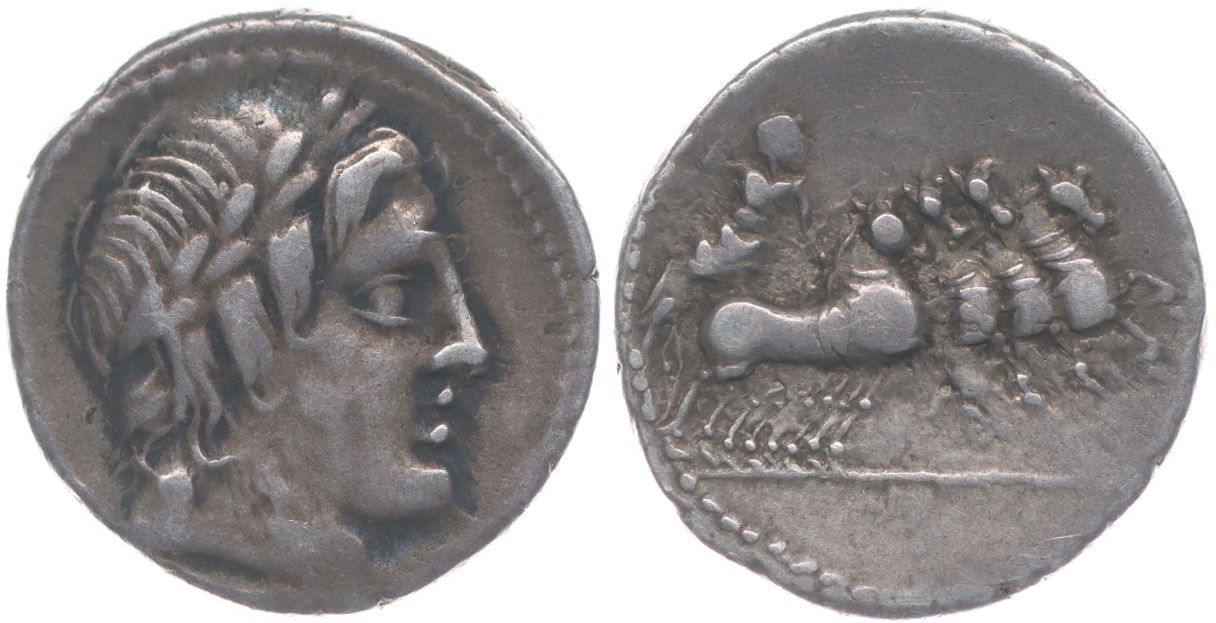 AR Denár, hlava Vejovis zprava / Jupiter s bleskem v bize zprava Crawford.350A/2, S.266, Al.1223, Ves.1162