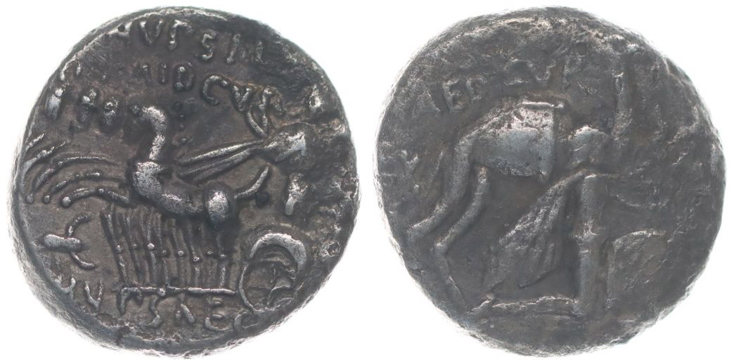 AR denár, Jupiter v Quadrize zleva / klečící mužská postava drží palmovou ratolest, Cr.422/1, S.378, Al.1343, Ves.1266