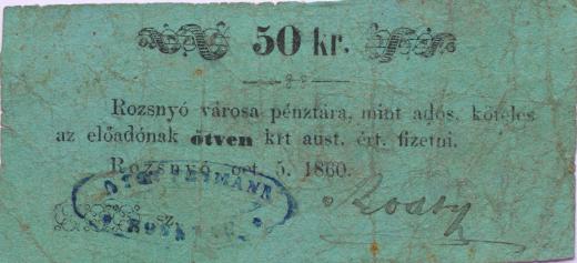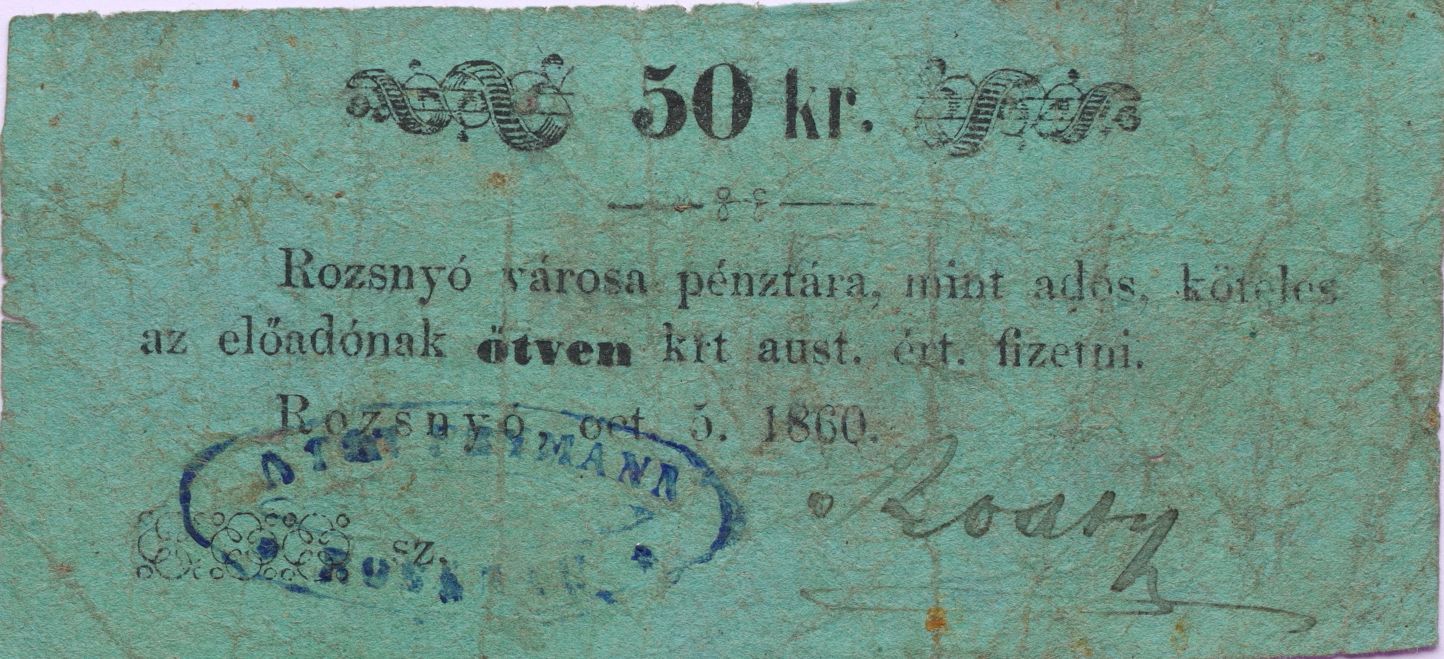 Rožňava (Rozsmyó) - 50 Krejcar 5.10.1860, bez čísla, s razítkem Adam.Roz.3.3.1