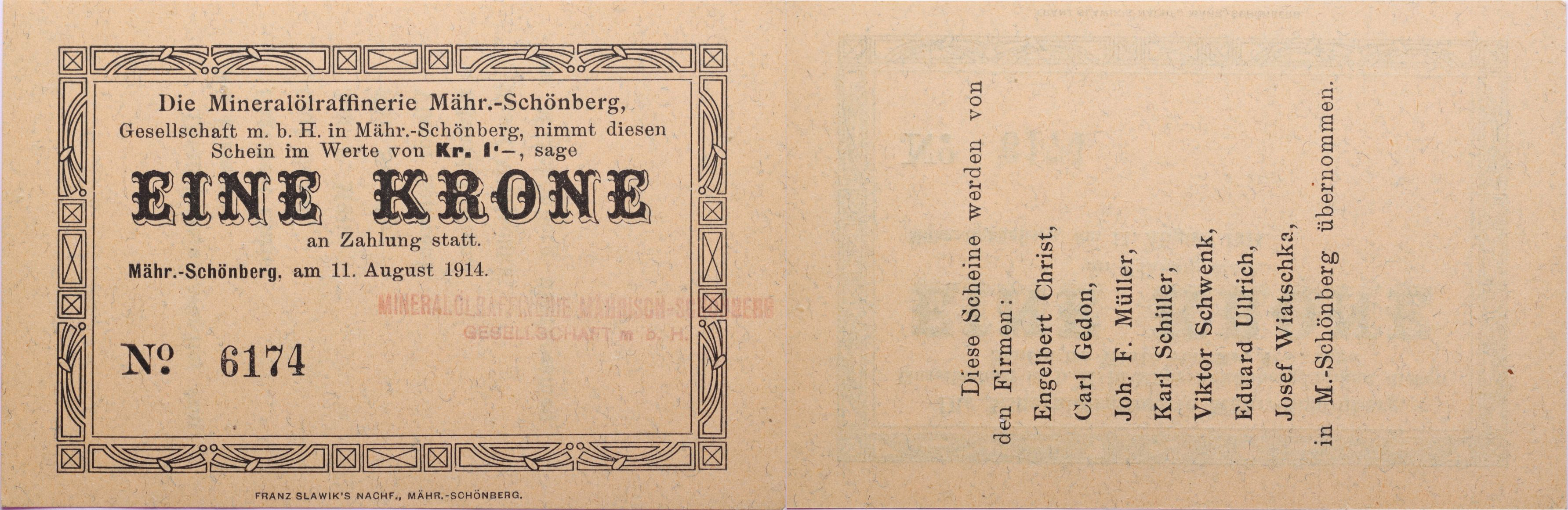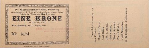 Šumperk (M.Schönberg), mineral.raf., 1 Krone 11.8.1914, DH.120.2.2.q, s razítkem, bez podpisu