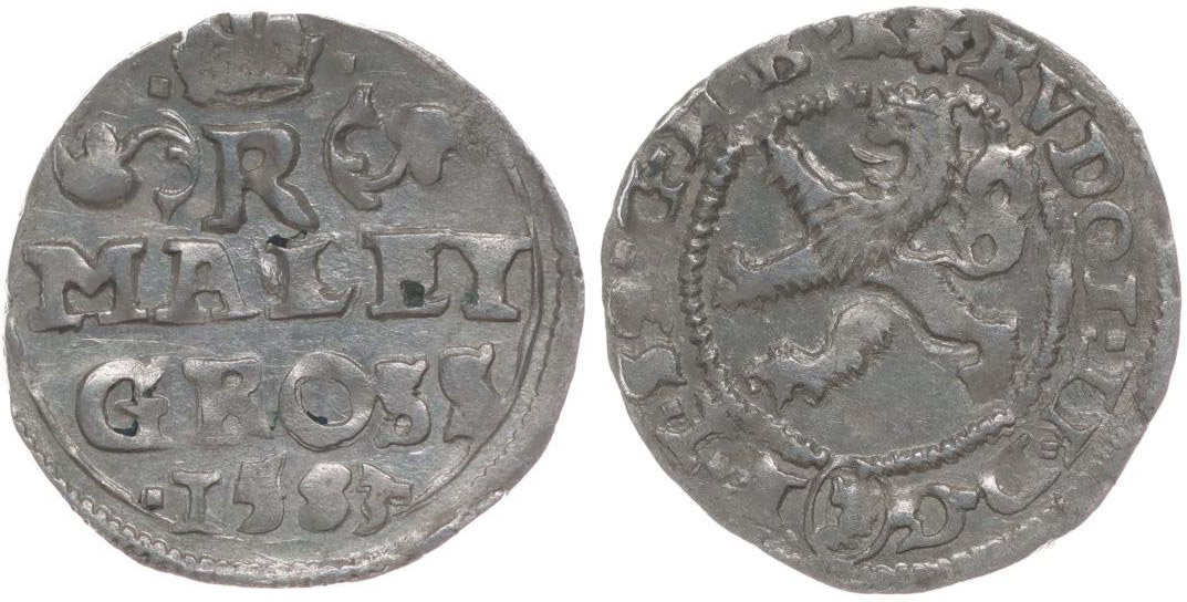 Malý groš 1585, K.Hora-Šatný, HN.1b (opis 7a), Ja.6b_dr.ned.