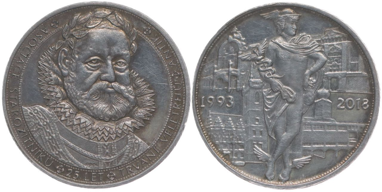 25 let trvání veletrhu Antik - asociace starožitníků 1993 - 2018 Poprsí císaře Rudolfa II. čelně mírně zprava, opis / stojící antická postava, v pozadí dominanty Prahy, Ag 20mm, 2,63 g