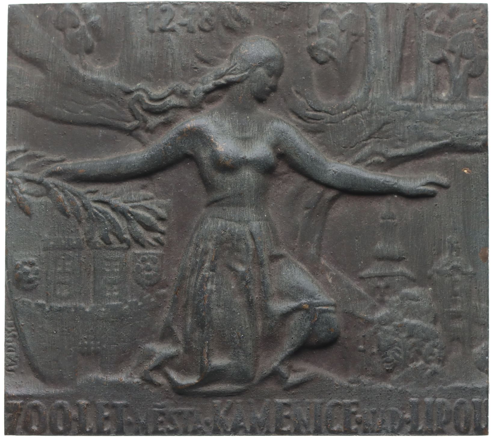 J.V.Dušek - 700 let města Kamenice nad Lipou 1248 - 1948 Klečící ženská postava, 1řádk.nápis, Sign., Bronz.plaketa 95x105 mm _jednostranná