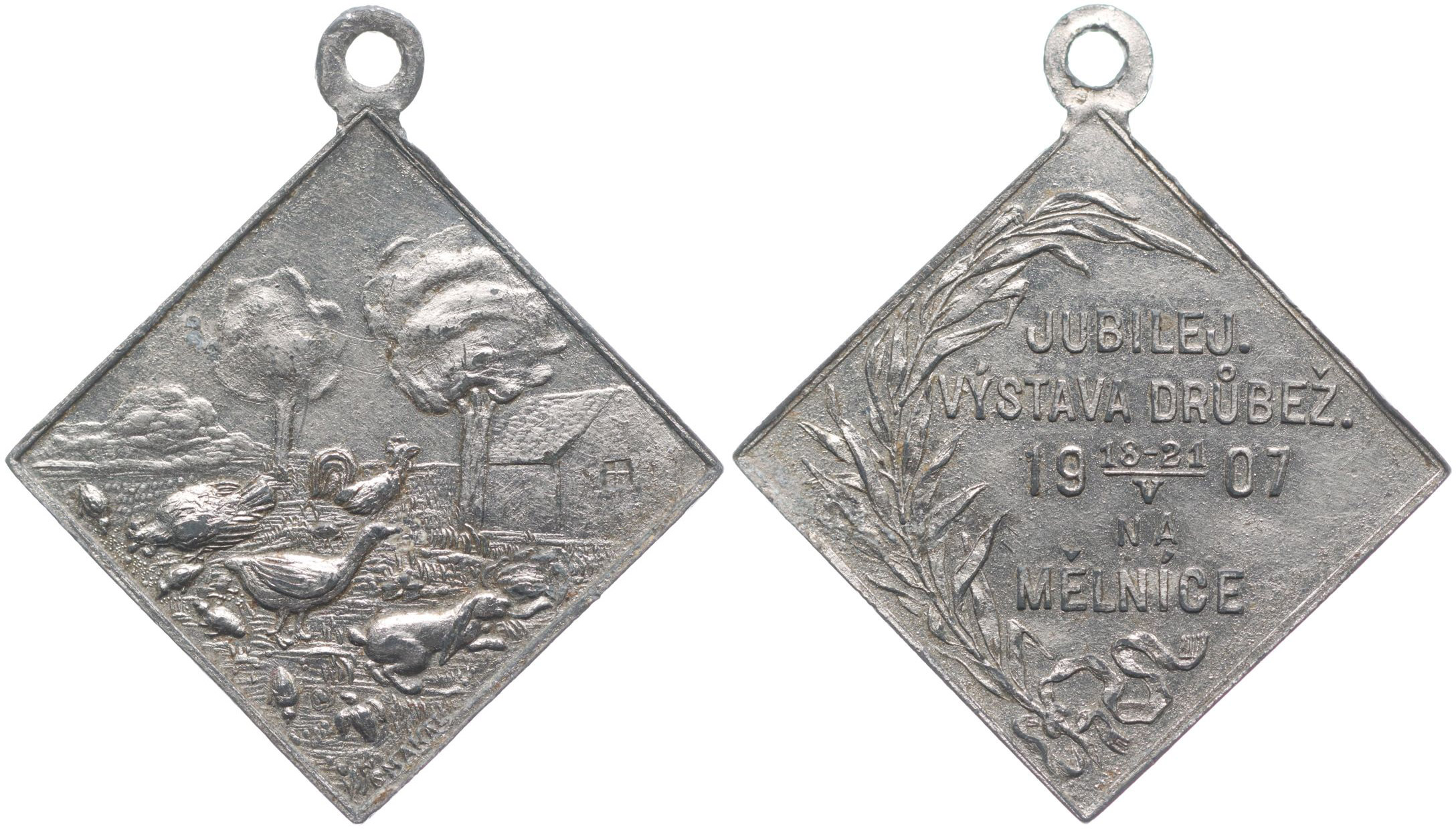 Jubilejní výstava drůbeže, 18.-21.5.1907 Drobné domácí zvířectvo před domem / 5-řádkov.nápis ve vavřínové ratolesti, Sign.ŠMAKAL, Sn klipa 25x25 mm s orig.raž.ouškem_R!