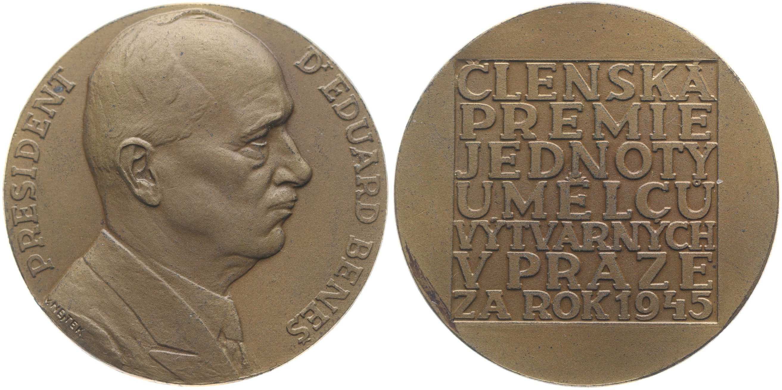 V.Nejtek - členská prémie Jednoty umělců výtvarných v Praze za rok 1945, portrét zprava, opis / 7řádk.nápis Sign., Bronz 40 mm, 29,50 g, Nov.02.030a