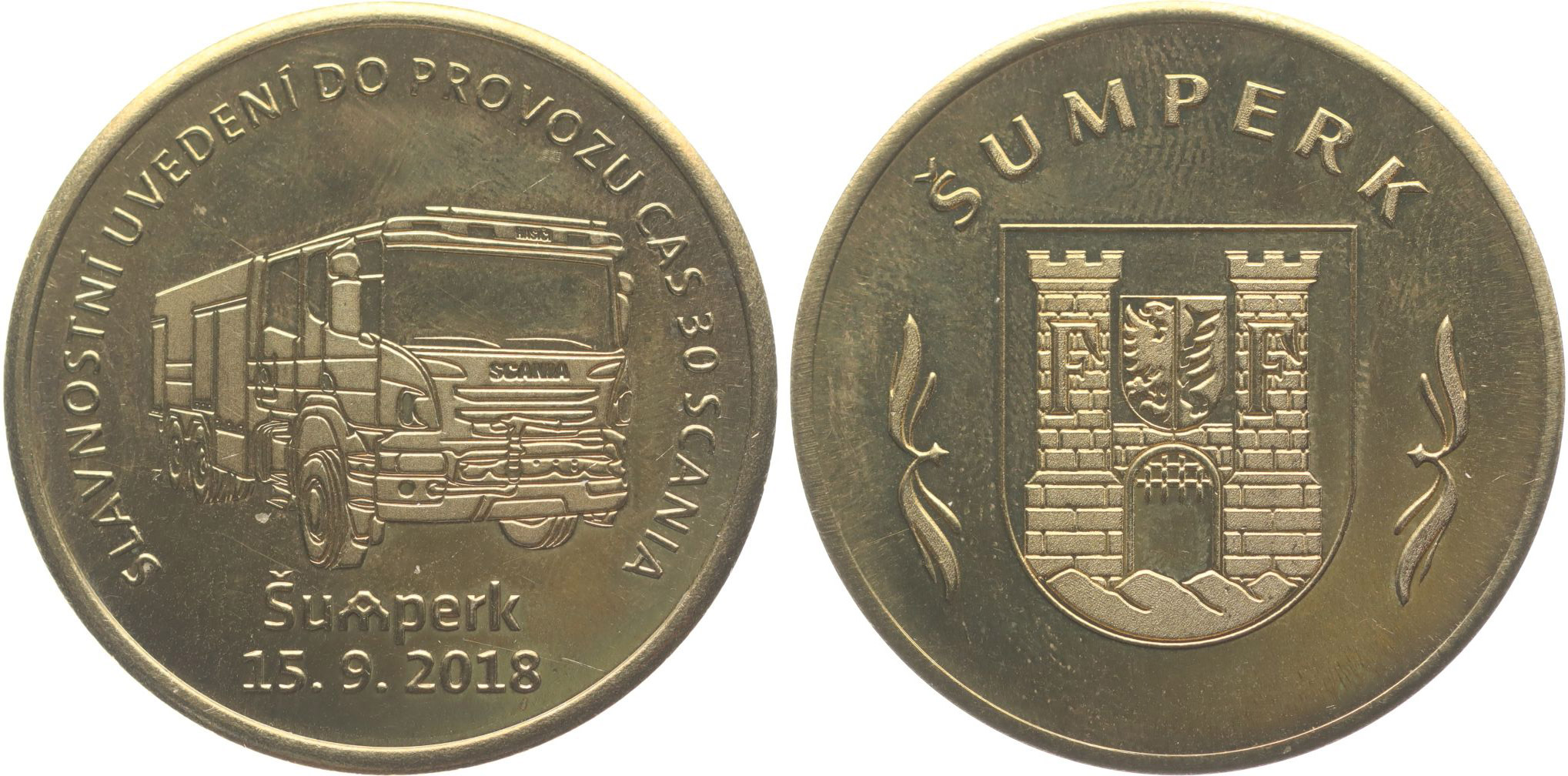 Šumperk - slavnostní uvedení do provozu CAS 30 Scania 15.9.2018 Pohled na hasičský automobil, 2řádk.nápis, opis / znak města, opis Mosaz 35 mm_obal s razítkem R!