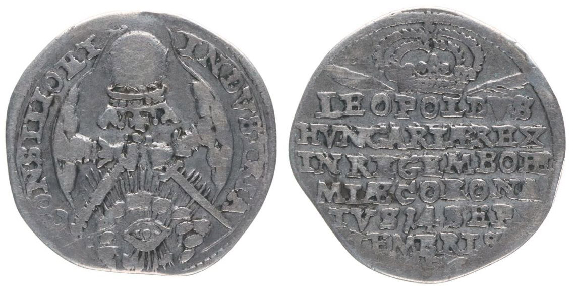 Malý žeton na korunovaci na českého krále v Praze 14.9.1656 7řádk.nápis pod korunou / pod božím okem drží dvě ruce žezlo a meč, Ag 17 mm, 1,41 g, Nov.IX/D-5b, Mo.-, Do.2459_R!