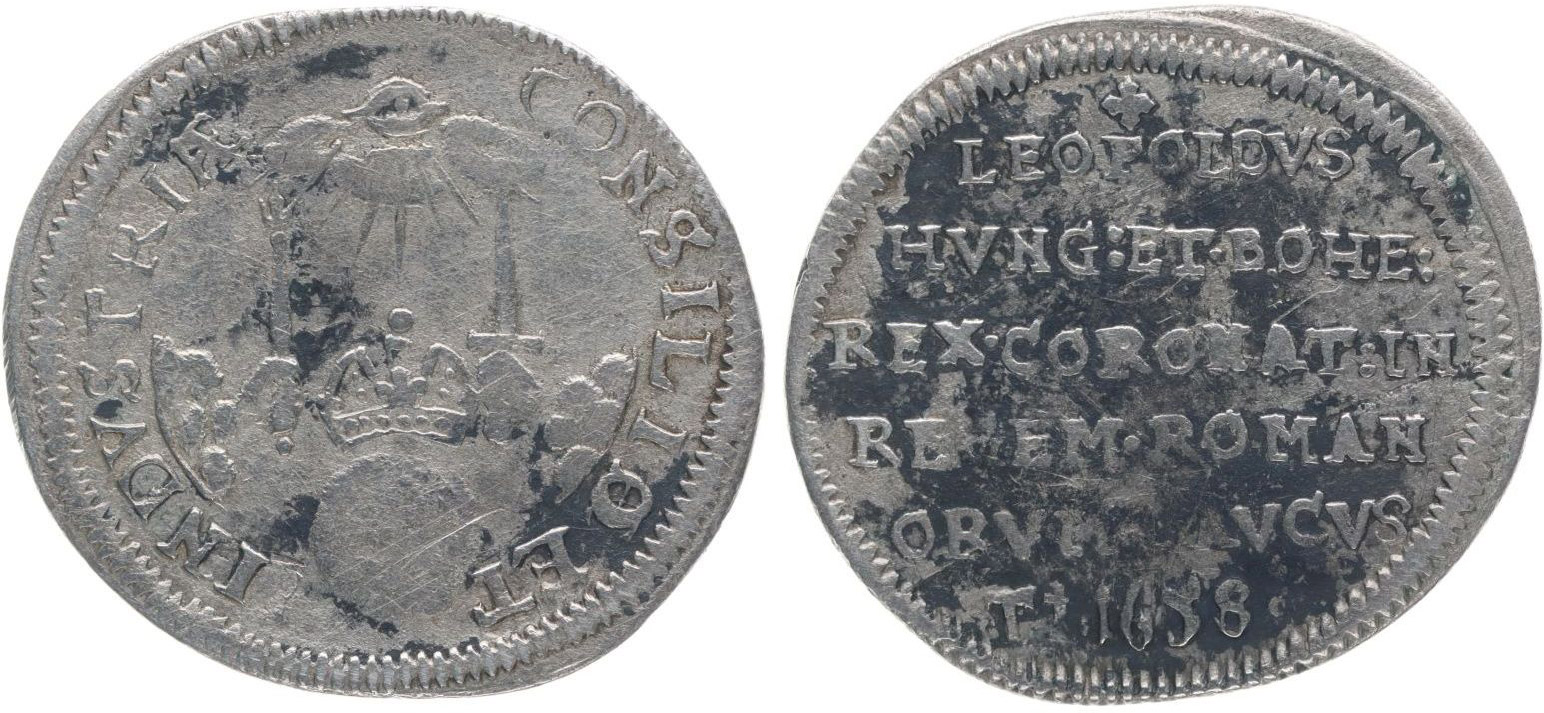 Střední žeton na císařskou korunovaci ve Frankfurtu, 1.8.1658 Pod božím okem drží dvě ruce žezlo a meč, opis / 6řádk.nápis Ag 24 mm, 2,95 g, Nov.IX/E-12a, LG.XV/35, JF.502_R!