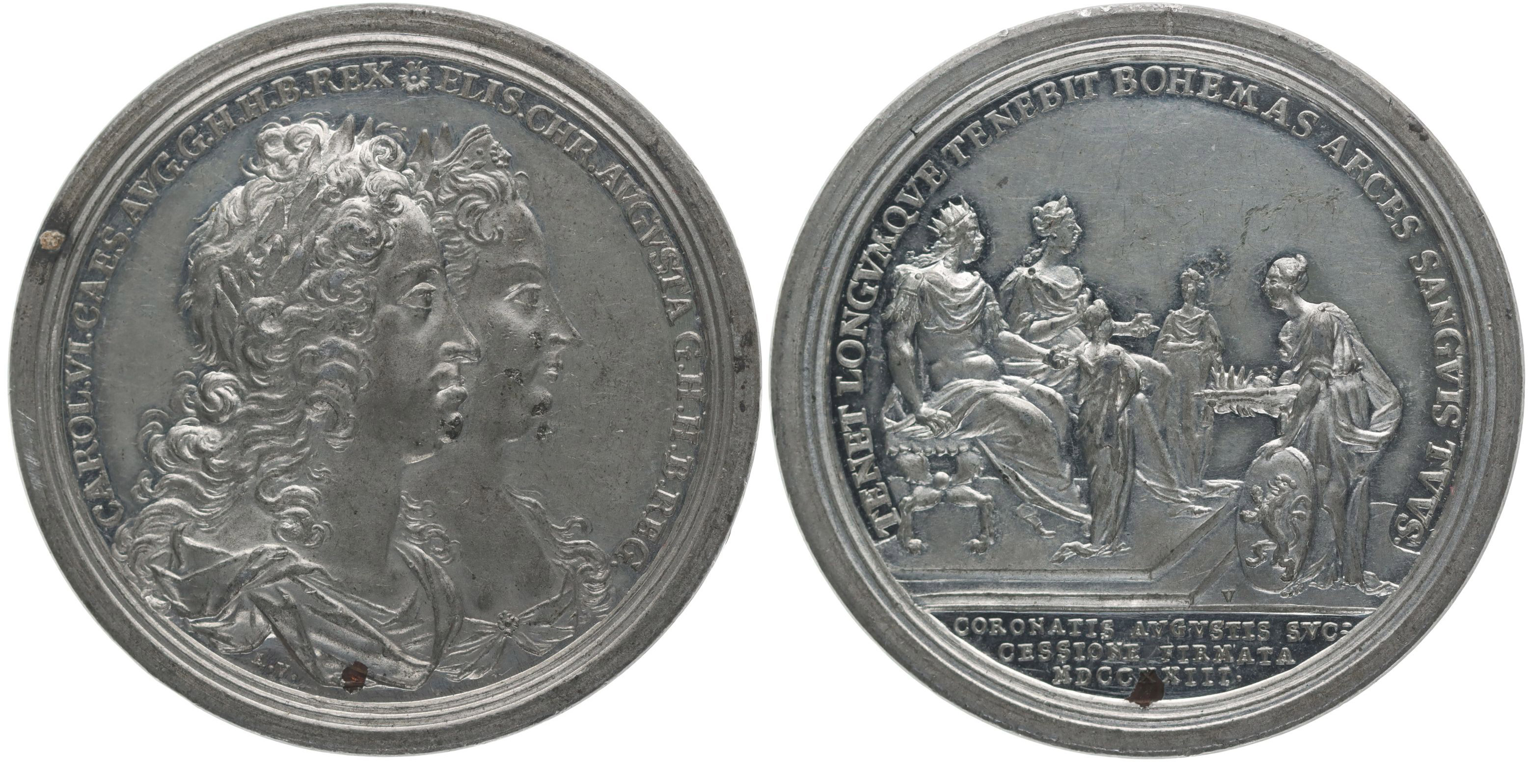Vestner - medaile na českou korunovaci manželů, 1723 Dvojprtrét zprava, opis / Bohemia proti manželskému páru, 3řádk. nápis v úseči, opis, Sign.,A.V., V., Sn 49 mm, 32,24 g, Nov.XI/FF-6c, Mo.1582 (Ag), Ho.2676, LG.XV/825_R!