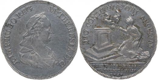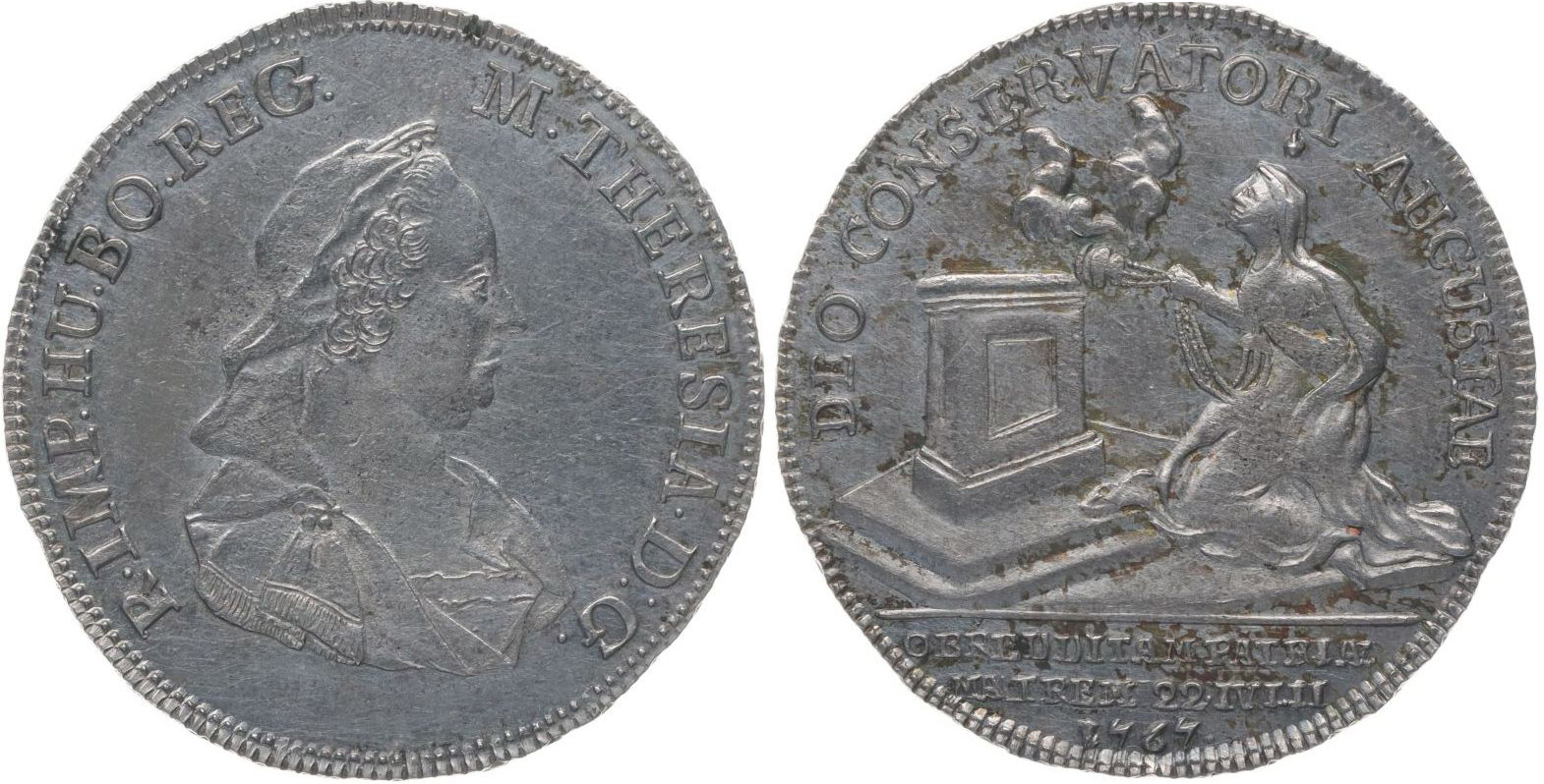 Větší peníz na uzdravení od neštovic, 1767 Portrét, opis / císařovna klečící před oltářem, opis, Ag 25 mm, 4.10 g, Mo.1978, ČS.1370, Ho.2948, LG.XIV/223