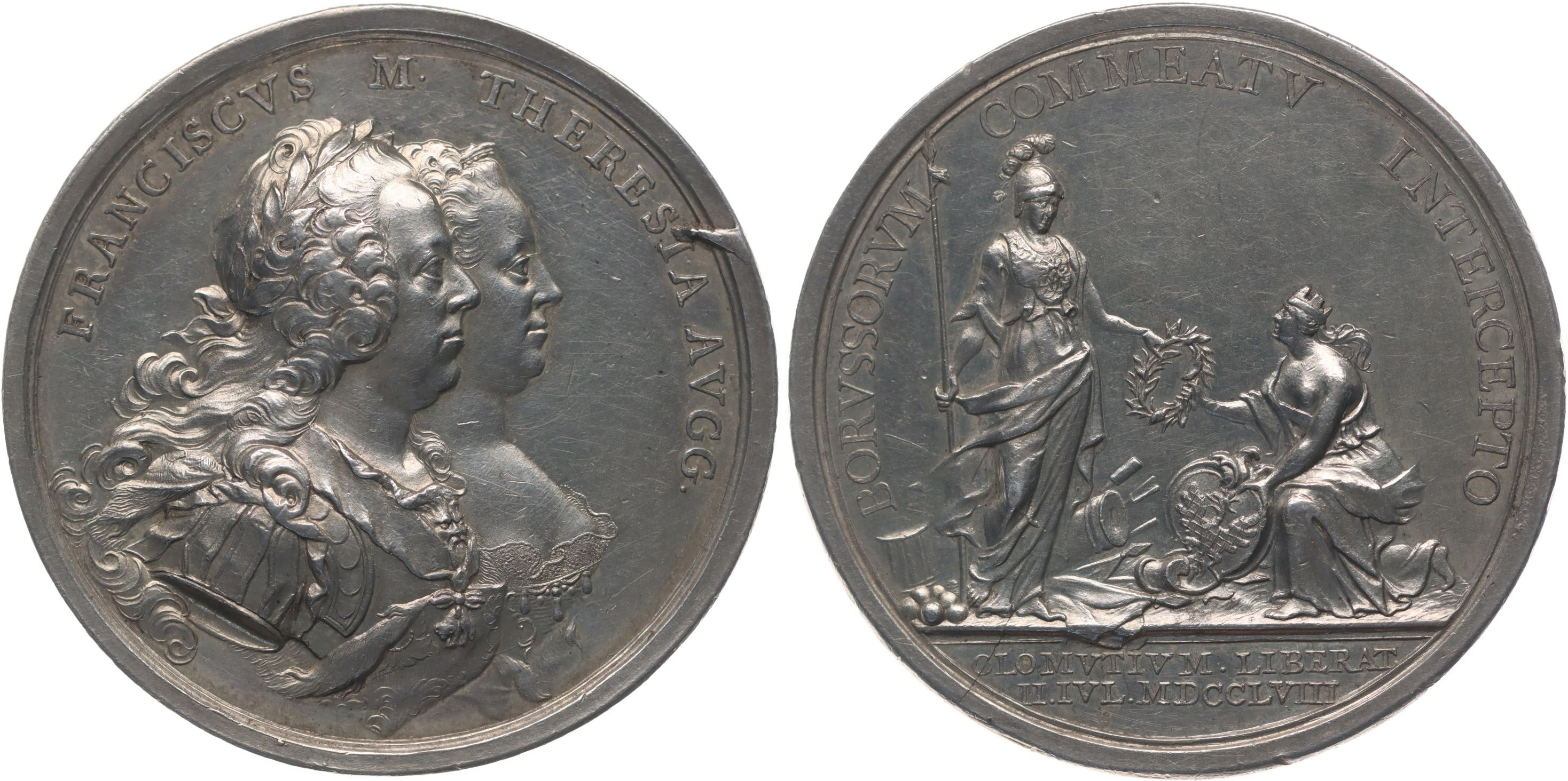 A.Wideman - medaile na obsazení Olomouce II.Juli 1759 Dvojportrét Frant.Lotrinského a Marie Terezie zprava, opis / stojící Bellona s mírovými atributy podává věnec klečící Moravii, 2řádk.nápis, opis, Nesign., Ag 46 mm, 34,96 g, Mo.1865, SD.136a LG.XIV/146_RR!