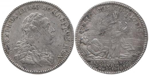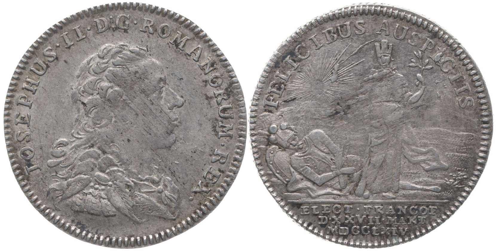 Větší peníz na volbu ve Frankfurtu, 27.3.1764 Portrét císaře zprava, opis / patronka města nad spoutaným válečníkem, opis, nápis v úseči, Ag 26 mm, 4,50 g, JF.841b, Nov.XV/B-3b _č.just. v av. a rev.
