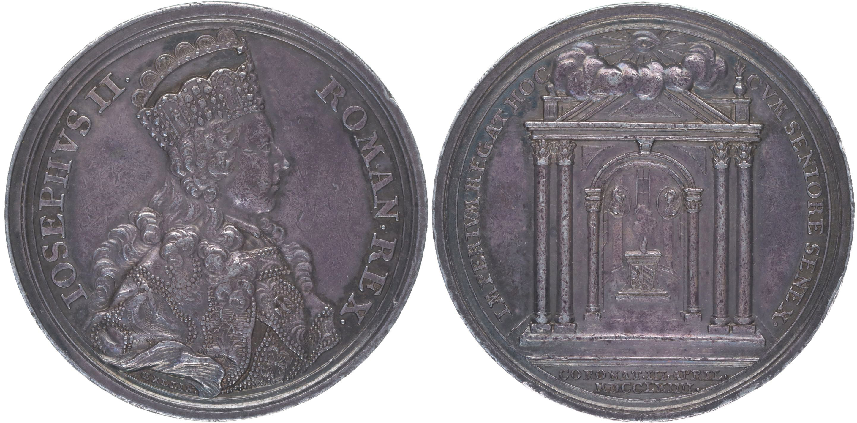 J.L.Oexlein - medaile na korunovaci na římského krále 3.4.1764#Ag Portrét zprava, opis / vchod do chrámu s oltářem, 2řádk.nápis v úseči, opis, Sign., Ag 45 mm, 29,15 g, Nov.XV/C-5a, Ho.3126, Mo.-, LG.XIV/179