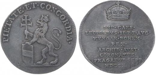 Menší peníz na korunovaci v Praze, 6.IX.1791 Koruna, nápis / stojící lev, znak a Svatoondřejský kříž, opis, Ag 21 mm, 2.15 g, Nov.XVI/Q-4b, ČS.1433, Don.3053, Mo.2242 _n.just. v rev.