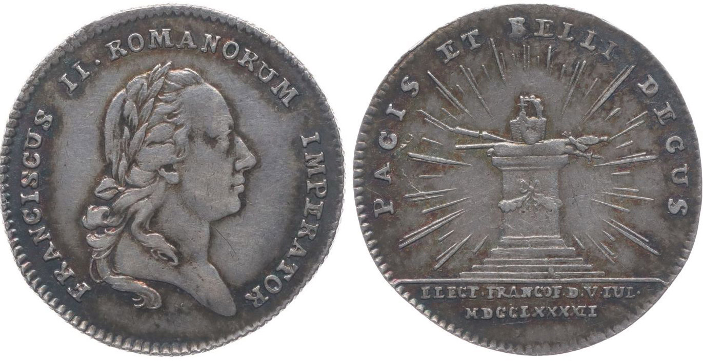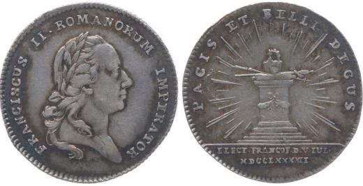 Menší peníz na volbu za římského císaře ve Frankfurtu, 5.VII.1792 Portrét zprava, opis / korunovační klenoty - římská koruna zleva, 2řádk.nápis, opis, Nesign., Ag 22 mm, 2 g, Nov.XVII/D-3b, Mo.- LG.XIV/1193