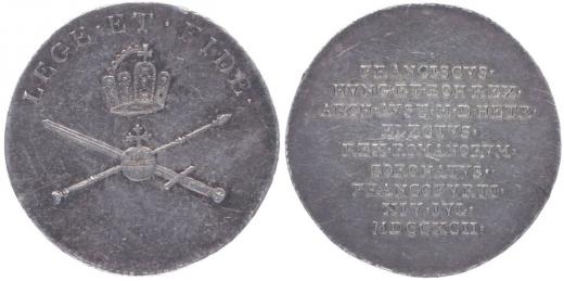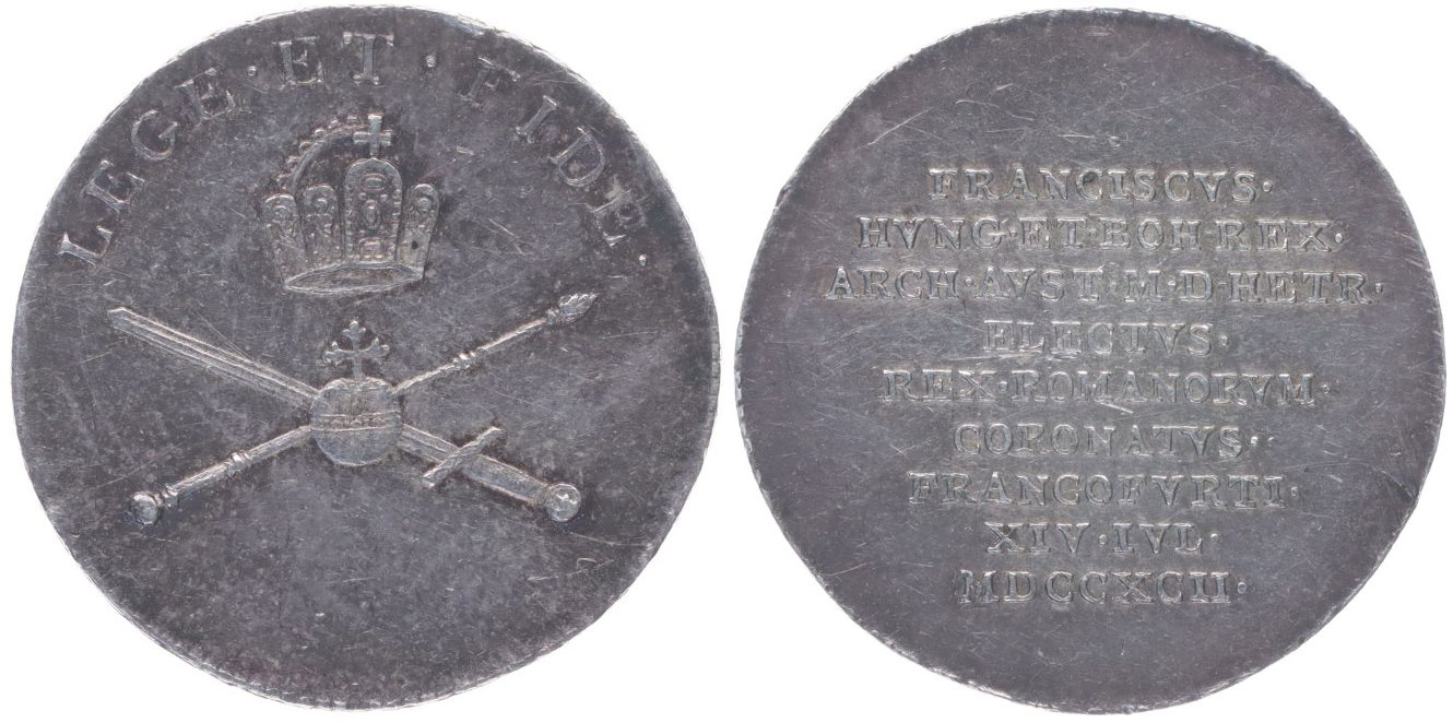 Menší peníz na korunovaci ve Frankfurtu, 14.VII.1792 Koruna, žezlo, meč a jablko, opis / 9-řádkový nápis, Nesign., Ag 20.5 mm, 2.19 g, Nov.XVII/E-8b, Mo.2270, Ho.3334_dr.hr.