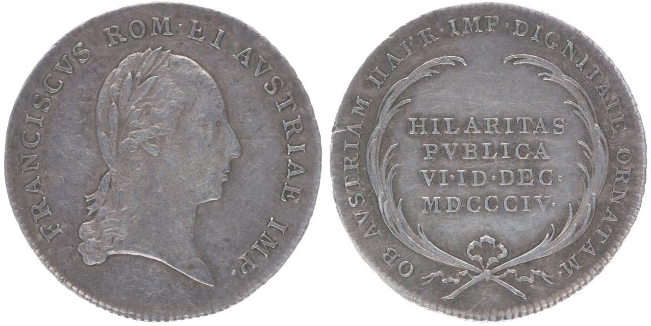 Menší peníz na vyhlášení Rakouského císařství 1804 Portrét zprava, opis / 4-řádk. nápis ve věnci, opis, Nesign., Ag 20 mm, 2.15 g, ČS.1480, Mo.2337, Ho.3380, LG.XII/2