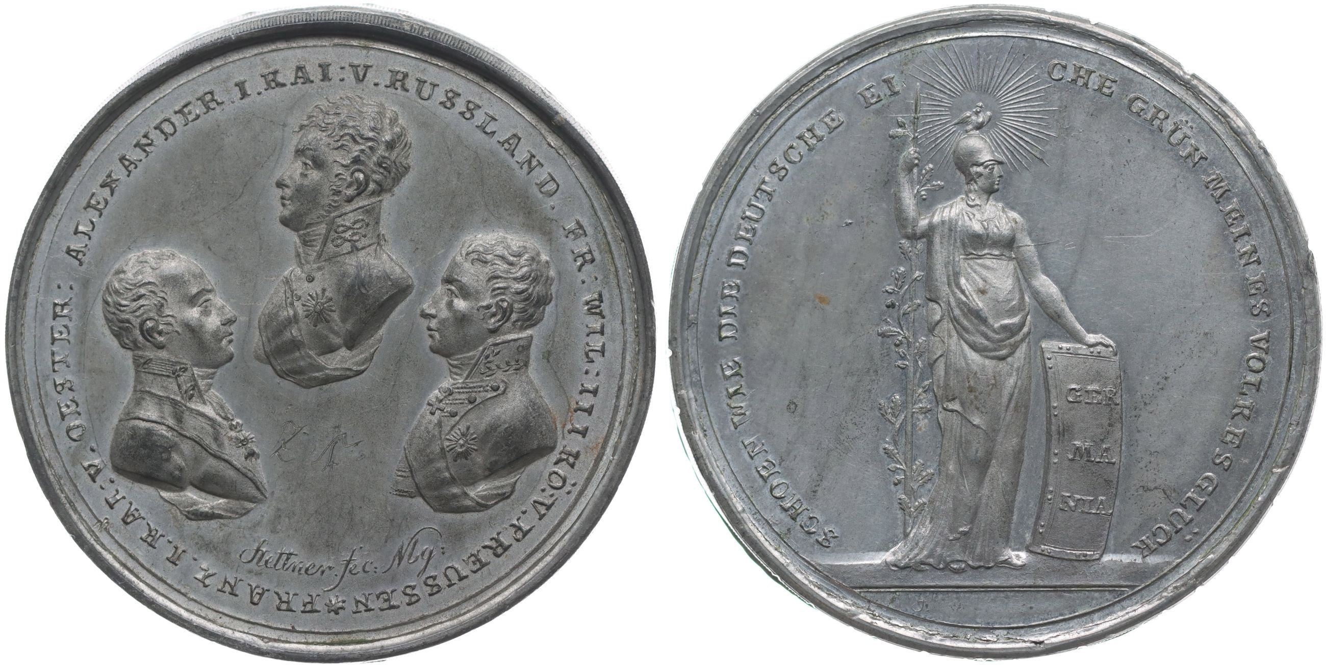 Kettner - poprsí tří císařů (Frant.II., Fr.Wilhelm III. a Alexandr I.) opis / stojící Germania s kopím a štítem, Sn 50 mm - složena ze dvou kusů, uprostřed 12 vložených obrázků s textem, Pressler.429