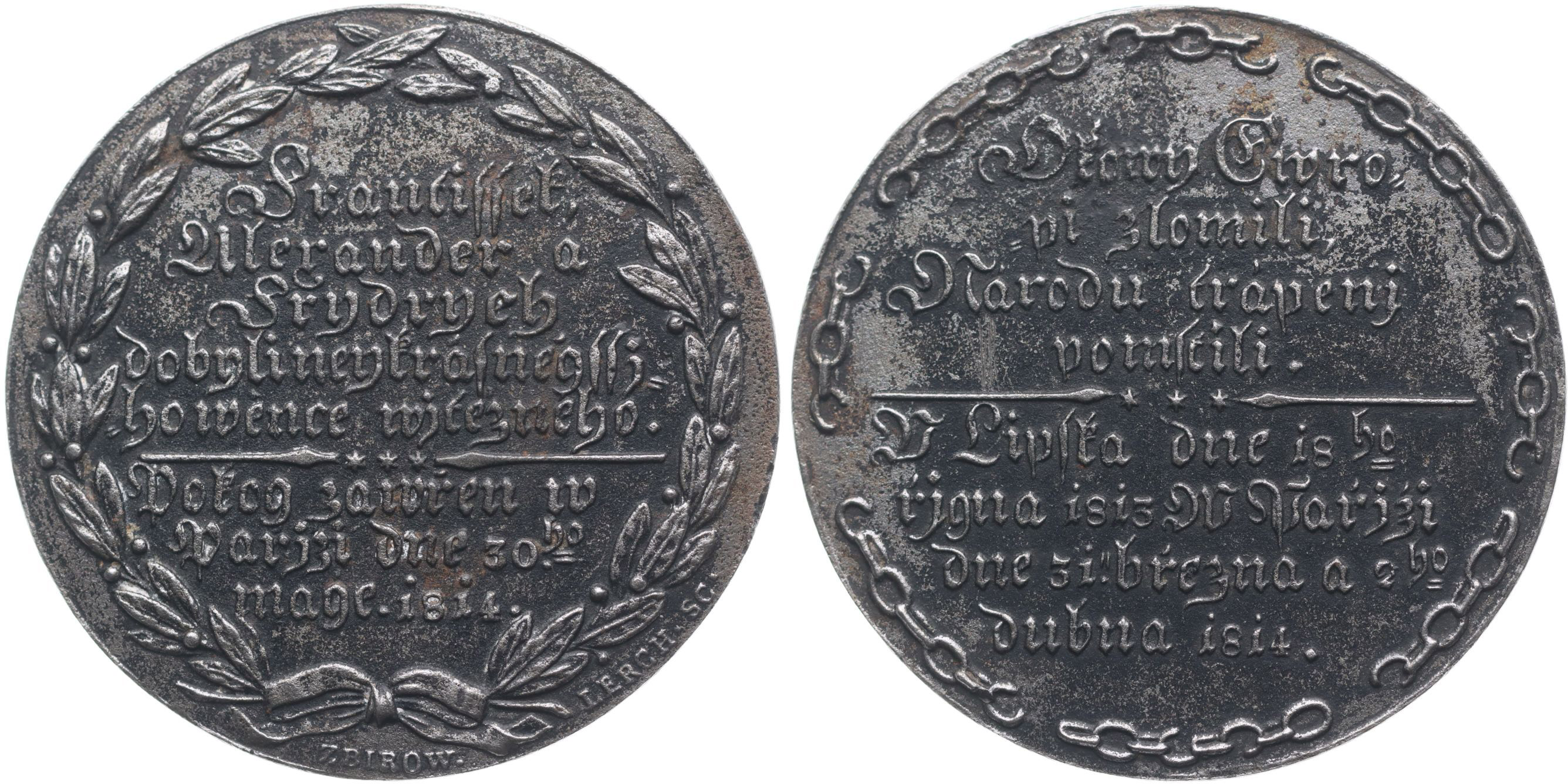 Lerch - pamětní medaile na vítězství spojenců nad Napoleonem 1814 8řádk.český text ve věnci / 8 řádk.český text v přerušovaném řetězu železárny Zbirov, Fe 53 mm, MZČ.137/1, ČS.1446
