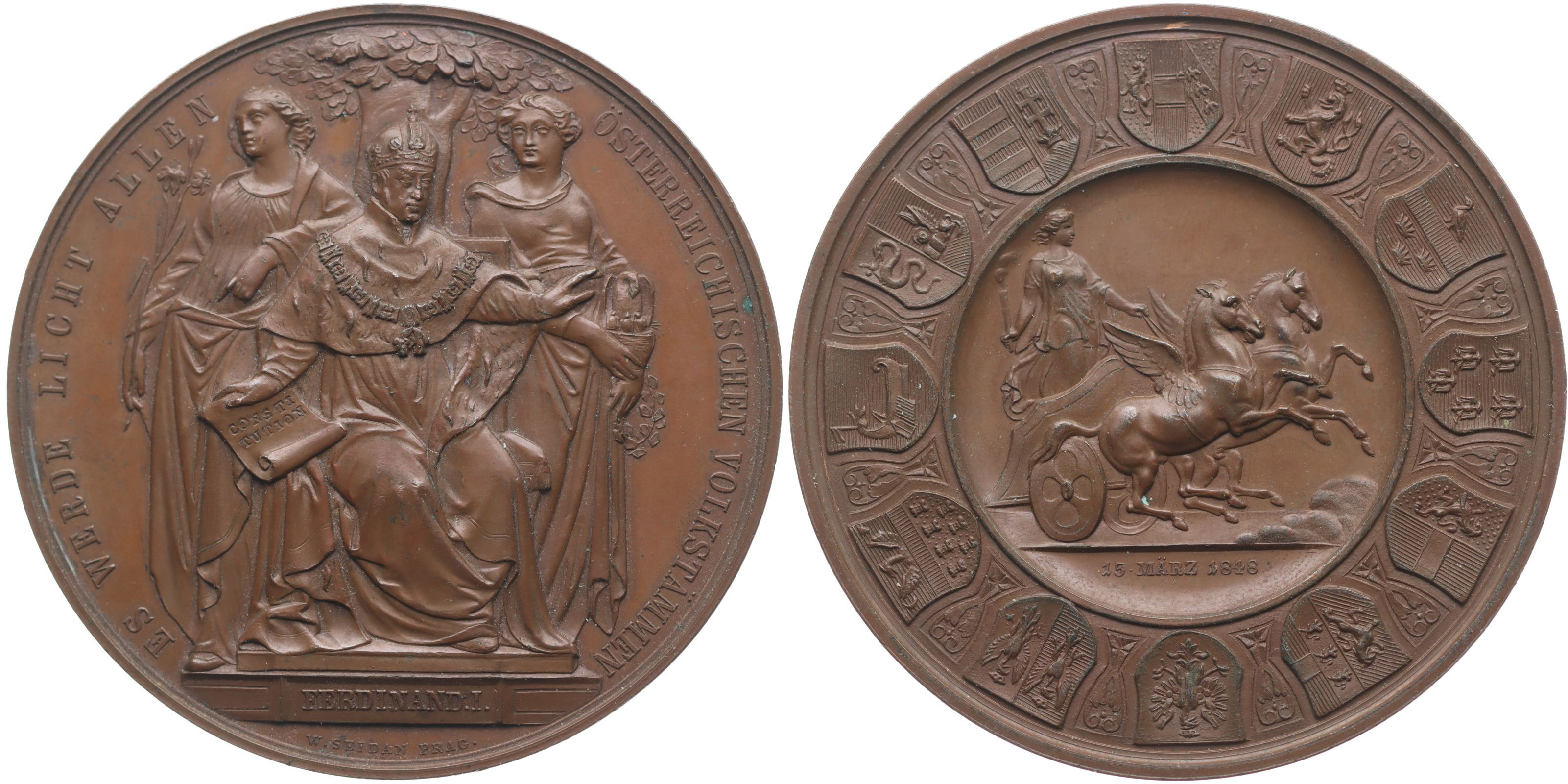V.Seidan - na vyhlášení konstituce 15.3.1848 Sedící císař čelně, po bocích dvě ženy, opis / ženská postava s dvojspřežím, Bronz 63 mm, ČS.1510, MZČ.150/6, Mr.6