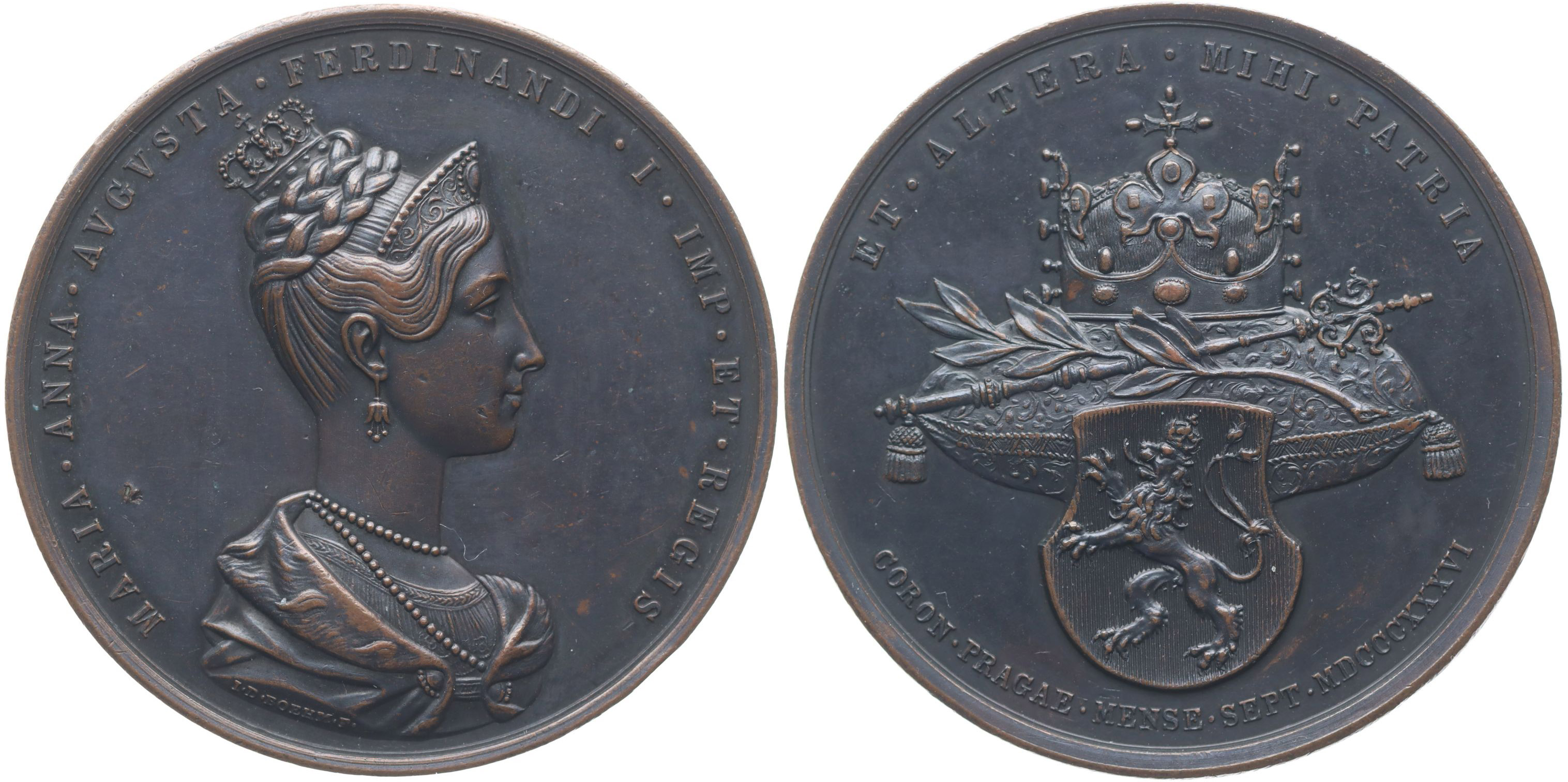 Boehm J.D. - medaile na korunovaci v Praze, 1836#Cu Korunov.poprsí zprava, opis / korunovovační klenoty na podušce, znak, opis, Cu 47 mm, 63,15 g, Nov.XVIII/H-1c, Mo.2558, ČS.1497, P.III/6
