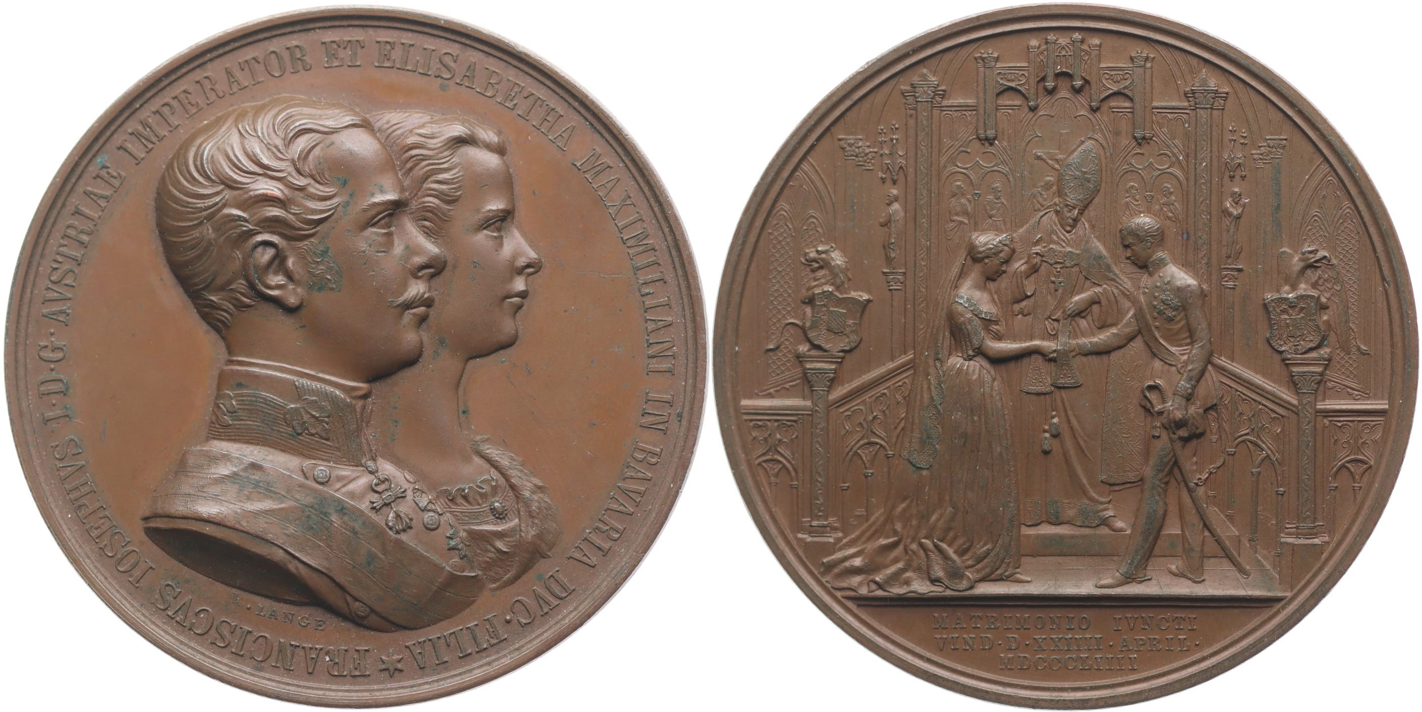 K.Lange - svatební medaile, 24.IV.1854#Br Dvojportrét zprava, opis / svatební scéna, nápis, Sign., Bronz 55 mm
