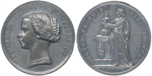 Nesign. - medaile na narození arc.Rudolfa Franze Karla Josefa, 1858 Portrét císařovny zleva, opis / císařovna s dítětem v rukou, opis Sn 30 mm, 8,36 g