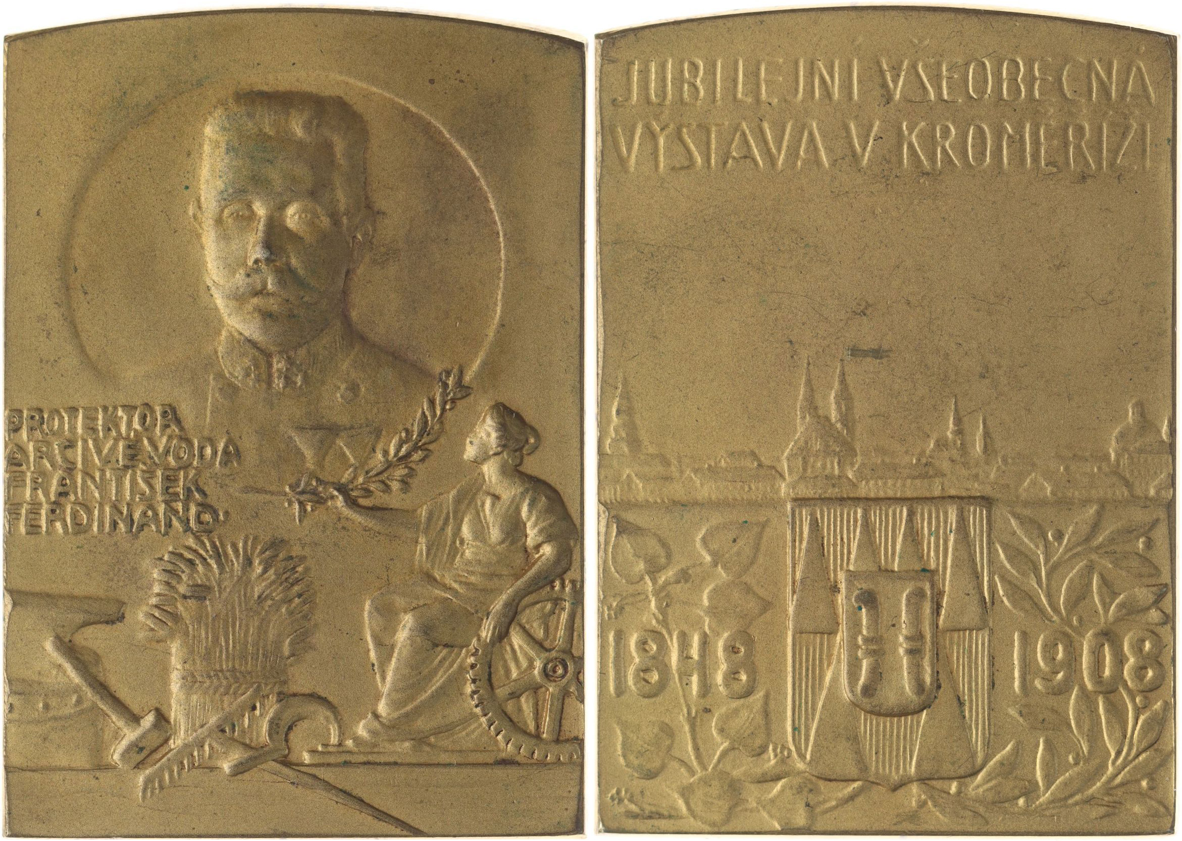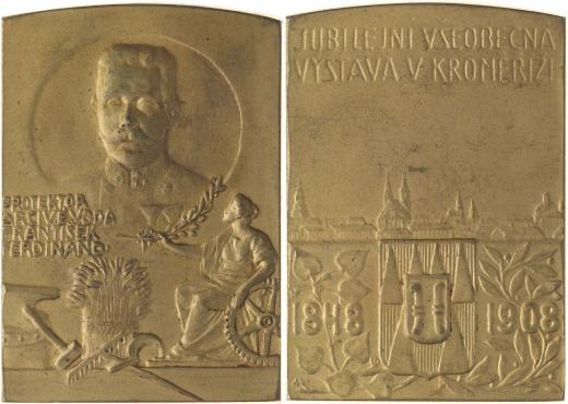 Nesign. - protektor arcivévoda František Ferdinand - jubilejní všeobecná výstava v Kroměříži 1848 - 1908, poprsí čelně nad výstavními atributy, 4řádk.nápis / pohled na město, pod ním znak a vročení Pozlac.bronz plaketa 37x52,5 mm, Haus.4102