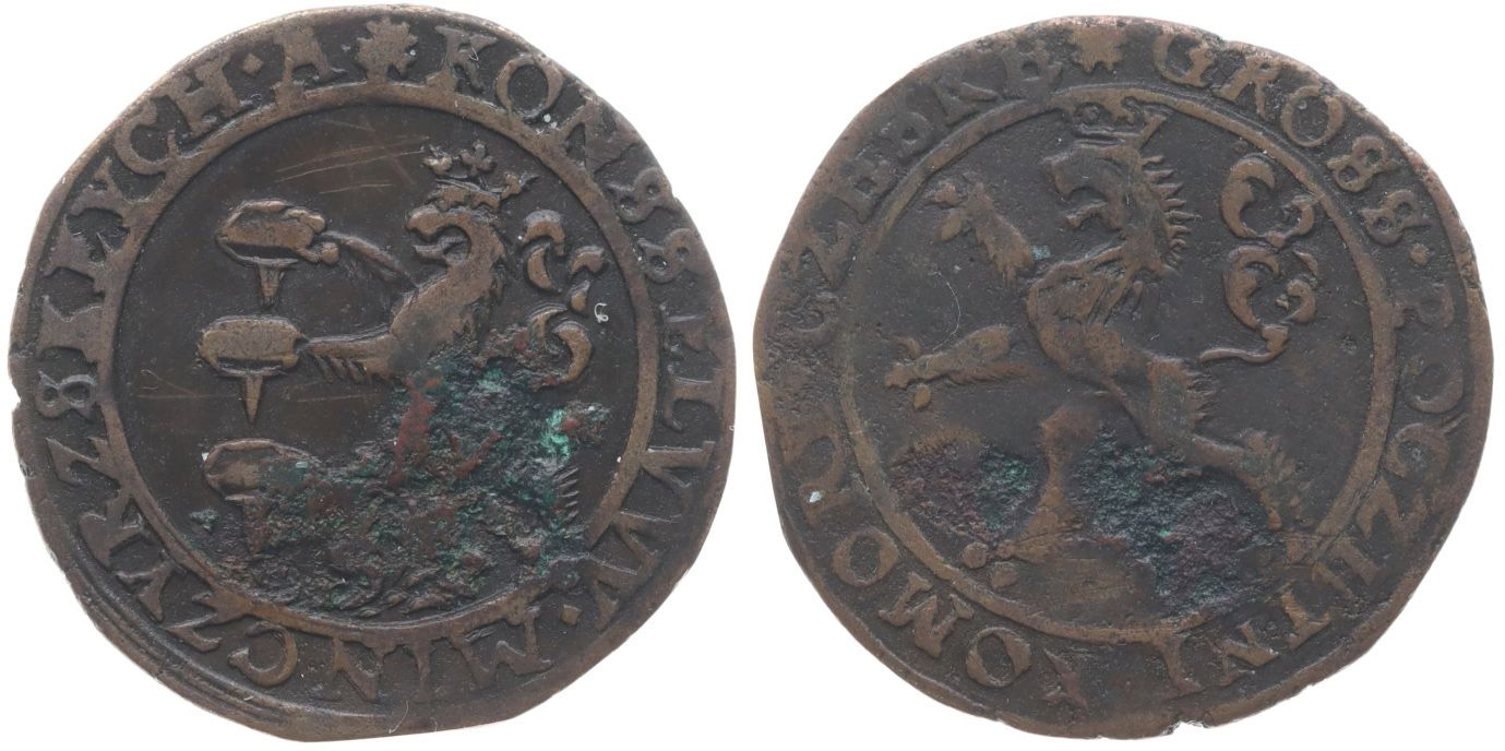Početní groš měděný b.l., český lev drží tři razidla, opis / český korunovaný lev zleva, opis, Cu 21,04 mm, 2,24 g, Pol.109 (tento kus) Smíš.155, Do.4509, Ho.6555_st.koroze v av. RRR!