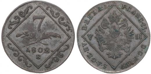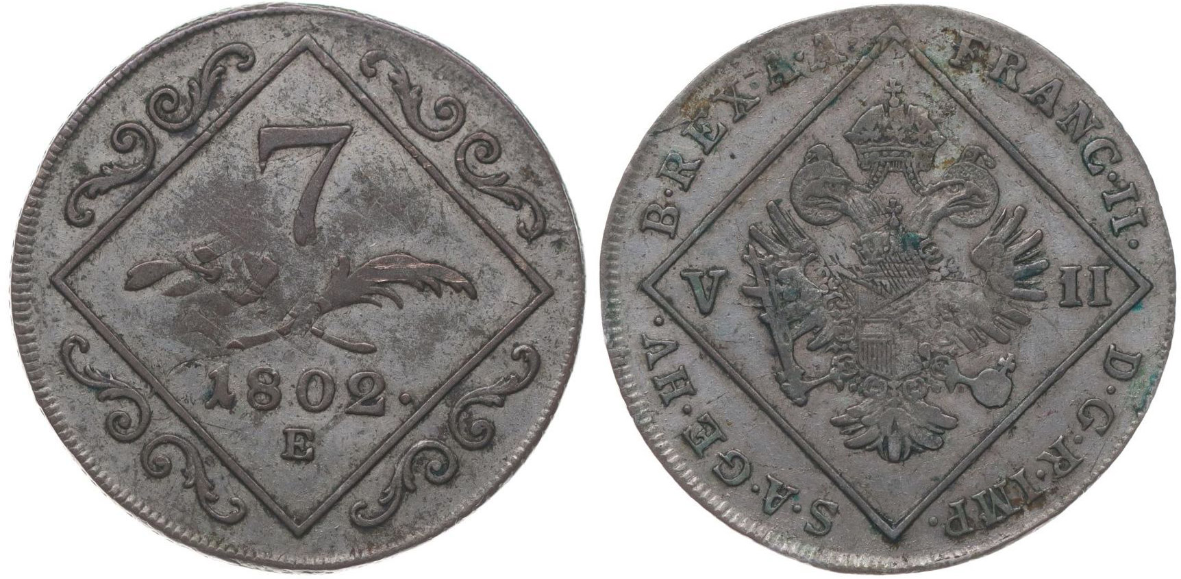 7 Krejcar 1802 E - dr.st.přeražby z 12 Krejcaru 1795